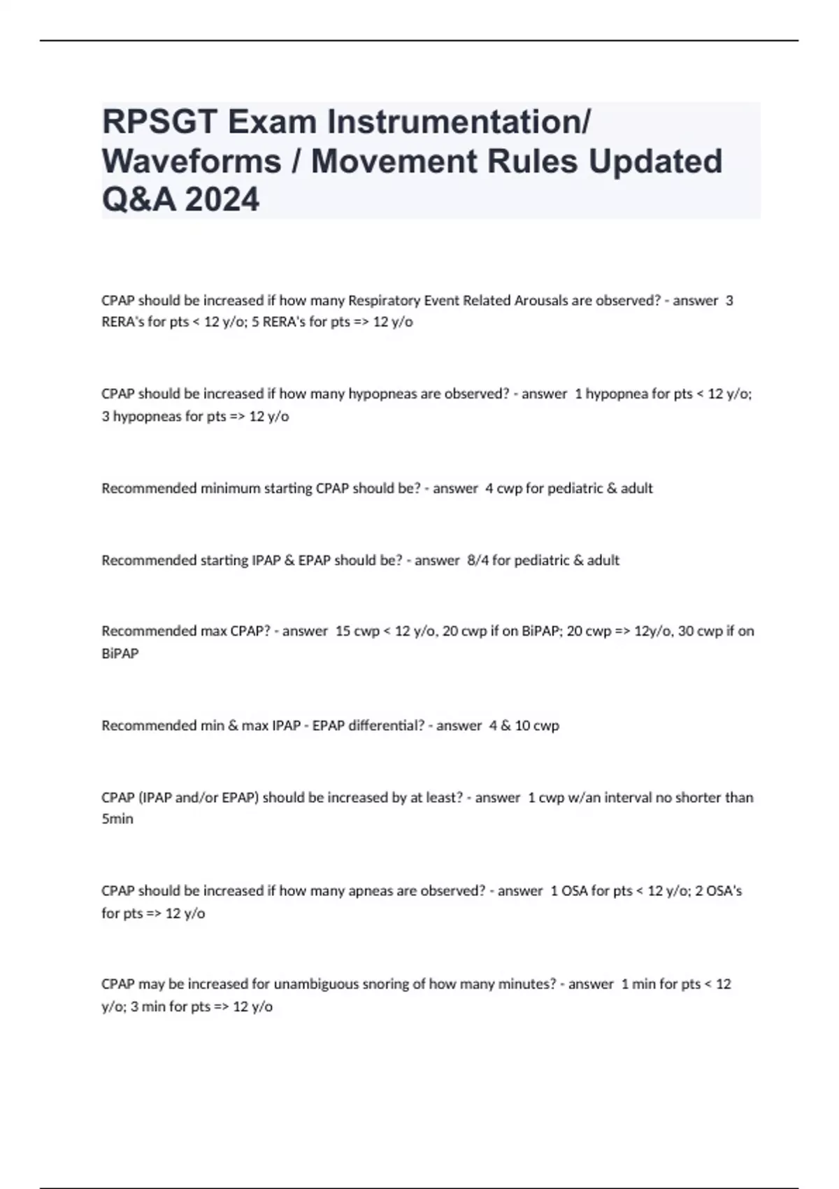 RPSGT Exam Instrumentation/ Waveforms / Movement Rules Updated Q&A 2024 CPAP should be increased if how many Respiratory Event Related Arousals are observed? 3 RERA's for pts 12 y/o; 5 RERA's for pts = 12 y/o CPAP should be increased if how many hypopneas are observed? 1 hypopnea for pts 12 y/o; 3 hypopneas for pts = 12 y/o Recommended minimum starting CPAP should be? 4 cwp for pediatric & adult Recommended starting IPAP & EPAP should be? 8/4 for pediatric & adult Recommended max CPAP? 15 cwp 12 y/o, 20 cwp if on BiPAP; 20 cwp = 12y/o, 30 cwp if on BiPAP Recommended min & max IPAP - EPAP differential? 4 & 10 cwp
