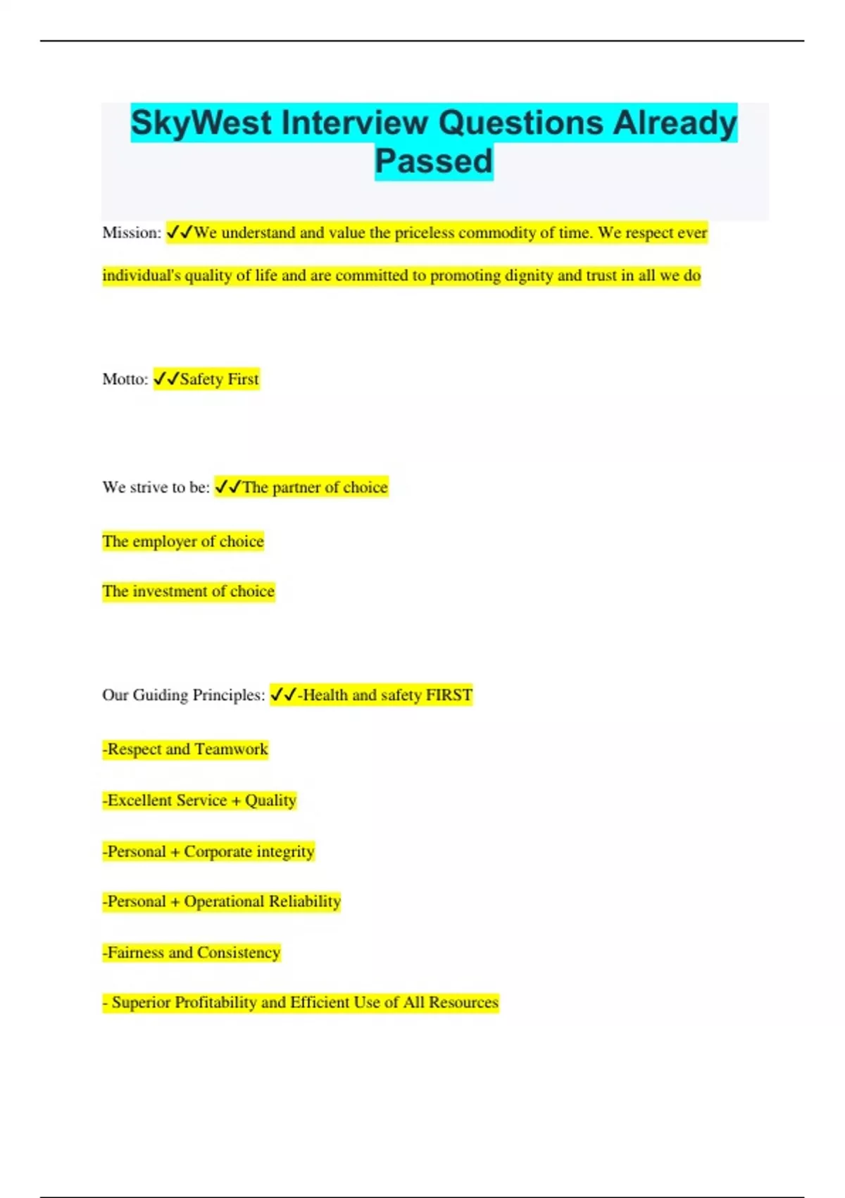 SkyWest Interview Questions Already Passed Mission: We understand and value the priceless commodity of time. We respect ever individual's quality of life and are committed to promoting dignity and trust in all we do Motto: Safety First We strive to be: The partner of choice The employer of choice The investment of choice Our Guiding Principles: -Health and safety FIRST -Respect and Teamwork -Excellent Service + Quality -Personal + Corporate integrity -Personal + Operational Reliability -Fairness and Consistency - Superior Profitability and Efficient Use of All Resources Are you willing to relocate? Yes What would you do if you had a passenger that wouldn't buckle their seatbelt? Emphasize safety- do it politely with a smile