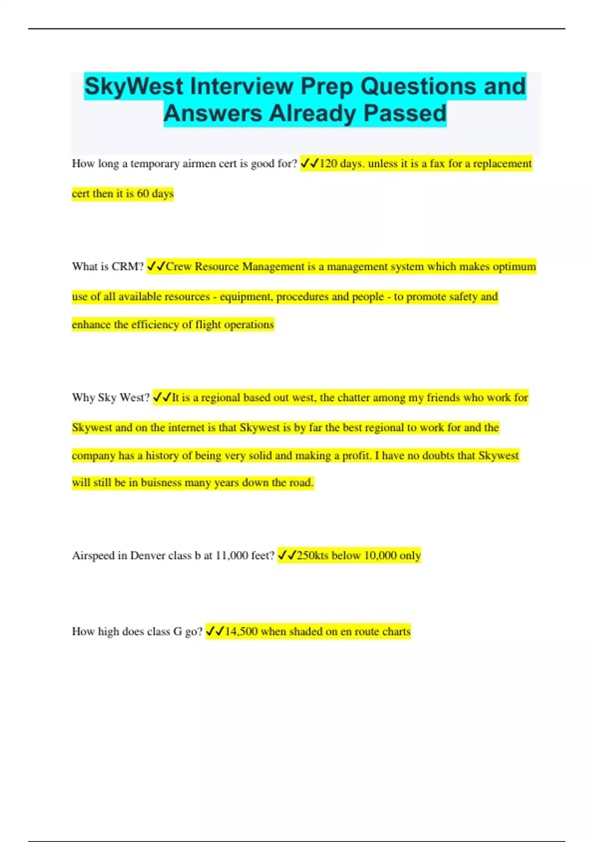 SkyWest Interview Prep Questions and Answers Already Passed