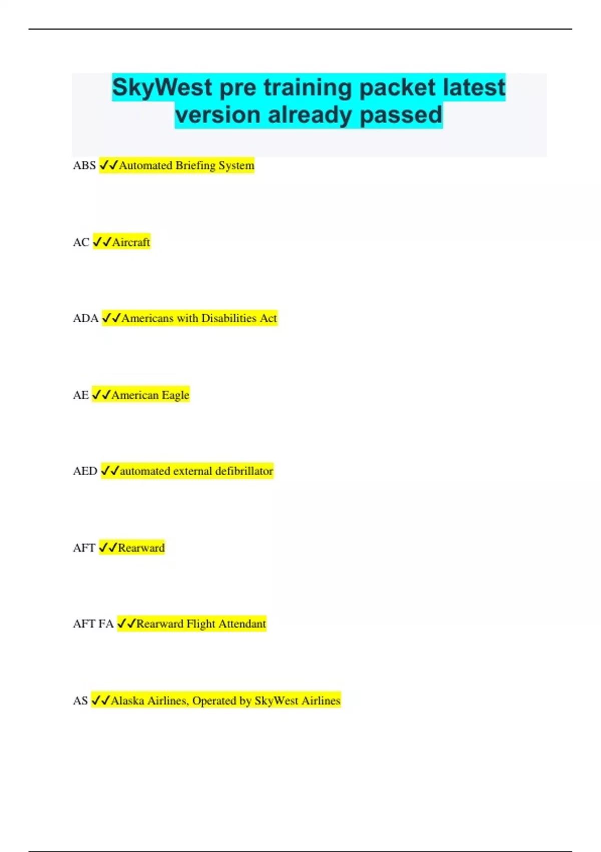 SkyWest pre training packet latest version already passed ABS Automated Briefing System AC Aircraft ADA Americans with Disabilities Act AE American Eagle AED automated external defibrillator AFT Rearward AFT FA Rearward Flight Attendant AS Alaska Airlines, Operated by SkyWest Airlines ASAP Aviation Safety Action Program ATC Air Traffic Control BCK Biohazard Cleaning Kit CDK Communicable Diseases Kit FAPM Flight Attendant Policy Manual COJ Company Observer Jumpseat CRJ Canadair Regional Jet CRM Crew Resource Management CRO Complaint Resolution Official CSA Customer Service Agent DGHM Dangerous Goods and Hazardous Materials DLC Delta Connection DOT Department of Transportation DVP Direct View Panel EDK Extended Delay Kit EGD Extended Ground Delay EMK Emergency Medical Kit ERJ 175 Embraer Regional Jet FA flight attendant FO First Officer FAA Federal Aviation Administration FAK first aid kit FAM Federal Air Marshal FAR Federal Aviation Regulation FFDO Federal Flight Deck Officer FFOD First Flight of the Day FWD forward