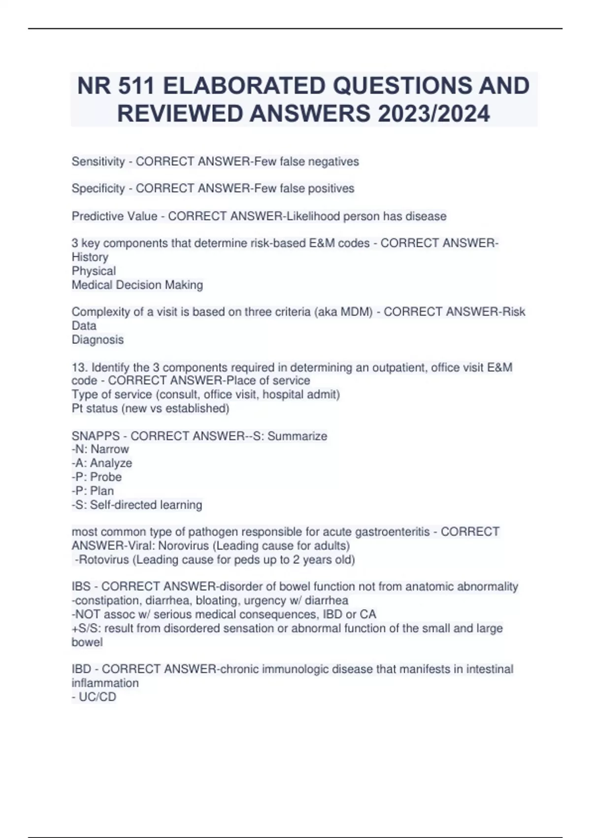 NR 511 ELABORATED QUESTIONS AND REVIEWED ANSWERS 2023/2024 Sensitivity - CORRECT ANSWER-Few false negatives Specificity - CORRECT ANSWER-Few false positives Predictive Value - CORRECT ANSWER-Likelihood person has disease 3 key components that determine risk-based E&M codes - CORRECT ANSWERHistory Physical Medical Decision Making Complexity of a visit is based on three criteria (aka MDM) - CORRECT ANSWER-Risk Data Diagnosis 13. Identify the 3 components required in determining an outpatient, office visit E&M code - CORRECT ANSWER-Place of service Type of service (consult, office visit, hospital admit) Pt status (new vs established) SNAPPS - CORRECT ANSWER--S: Summarize -N: Narrow -A: Analyze -P: Probe -P: Plan -S: Self-directed learning most common type of pathogen responsible for acute gastroenteritis - CORRECT ANSWER-Viral: Norovirus (Leading cause for adults) -Rotovirus (Leading cause for peds up to 2 years old) IBS - CORRECT ANSWER-disorder of bowel function not from anatomic abnormality -constipation, diarrhea, bloating, urgency w/ diarrhea -NOT assoc w/ serious medical consequences, IBD or CA +S/S: result from disordered sensation or abnormal function of the small and large bowel IBD - CORRECT ANSWER-chronic immunologic disease that manifests in intestinal inflammation - UC/CD UC - CORRECT ANSWER-the mucosal surface of the colon is inflamed and ultimately results in friability, erosions, and bleeding. - Most common in recto-sigmoid colon. Can involve entire colon - Pain in RLQ Chrons - CORRECT ANSWER-the inflammation extends deeper into the intestinal wall and can involve all or any layer of the bowel wall and any portion of the GI tract from the mouth to the anus. - Skipped lesions - Pain in LLQ Diverticulitis - CORRECT ANSWER-Symptoms: LLQ pain/ tenderness, fever, N/V/D Need imaging especially if perforation or peritonitis is suspected; free air = perforation; patient may have ileus, small or large bowel obstruction Can use plain x-ray CT or barium enema are preferred CT with contrast is more sensitive and accurate Barrett's Esophagus - CORRECT ANSWER-After repeated exposure to gastric contents, inflammation of the esophageal mucosa becomes chronic. · Blood flow increases, erosion occurs ·Premalignant tissue ·Increased risk for development of esophageal adenocarcinoma · Fibrosis and scarring during healing of erosions; leads to strictures Acute Appendicitis - CORRECT ANSWER-N/V RLQ pain Guarding Rebound Tenderness Dx: Elevated WBC, CT Tx: Remove appendix, ATB