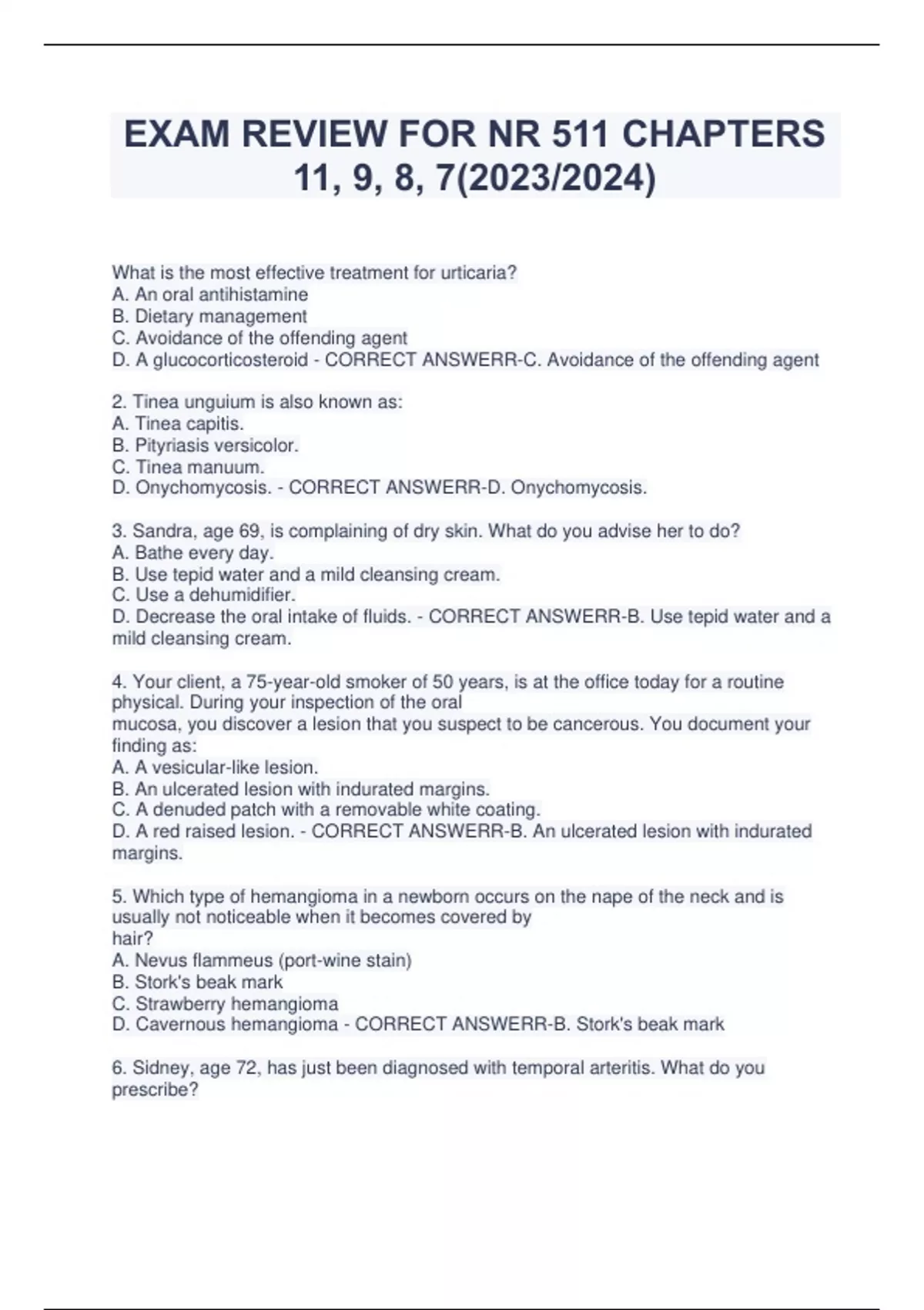 EXAM REVIEW FOR NR 511 CHAPTERS 11, 9, 8, 7(2023/2024) What is the most effective treatment for urticaria? A. An oral antihistamine B. Dietary management C. Avoidance of the offending agent D. A glucocorticosteroid - CORRECT ANSWERR-C. Avoidance of the offending agent 2. Tinea unguium is also known as: A. Tinea capitis. B. Pityriasis versicolor. C. Tinea manuum. D. Onychomycosis. - CORRECT ANSWERR-D. Onychomycosis. 3. Sandra, age 69, is complaining of dry skin. What do you advise her to do? A. Bathe every day. B. Use tepid water and a mild cleansing cream. C. Use a dehumidifier. D. Decrease the oral intake of fluids. - CORRECT ANSWERR-B. Use tepid water and a mild cleansing cream. 4. Your client, a 75-year-old smoker of 50 years, is at the office today for a routine physical. During your inspection of the oral mucosa, you discover a lesion that you suspect to be cancerous. You document your finding as: A. A vesicular-like lesion. B. An ulcerated lesion with indurated margins. C. A denuded patch with a removable white coating. D. A red raised lesion. - CORRECT ANSWERR-B. An ulcerated lesion with indurated margins. 5. Which type of hemangioma in a newborn occurs on the nape of the neck and is usually not noticeable when it becomes covered by hair? A. Nevus flammeus (port-wine stain) B. Stork's beak mark C. Strawberry hemangioma D. Cavernous hemangioma - CORRECT ANSWERR-B. Stork's beak mark 6. Sidney, age 72, has just been diagnosed with temporal arteritis. What do you prescribe? A. Systemic corticosteroids B. Topical corticosteroids C. Antibiotics D. Antifungal preparations - CORRECT ANSWERR-A. Systemic corticosteroids 7. Abe, age 57, has just been given a diagnosis of herpes zoster. He asks you about exposure to others. You tell him that: A. Once he has been on the medication for a full 24 hours, he is no longer contagious. B. He should stay away from children and pregnant women who have not had chickenpox. C. He should wait until the rash is completely gone before going out in crowds. D. He should be isolated from all persons except his wife. - CORRECT ANSWERR-B. He should stay away from children and pregnant women who have not had chickenpox. 8. What is the most important thing a woman can do to have youthful, attractive skin? A. Keep well hydrated. B. Use sunscreen with an SPF of at least 45. C. Avoid smoking. D. Use mild defatted or glycerin soaps. - CORRECT ANSWERR-C. Avoid smoking. 9. Tanisha, a 24-year-old African American mother of four young children, presents in the clinic today with varicella. She states that three of her children also have it and that her eruption started less than 24 hours ago. Which of the following may shorten the course of Tanisha's disease? A. Calamine lotion B. Cool baths C. Acyclovir (Zovirax) D. Corticosteroids - CORRECT ANSWERR-C. Acyclovir (Zovirax) 10. Johnny, age 12, just started taking amoxicillin for otitis media. His mother said that he woke up this morning with a rash on his trunk. What is your first action? A. Prescribe systemic antihistamines. B. Prescribe a short course of systemic steroids. C. Stop the amoxicillin. D. Continue the drug; this reaction on the first day is normal. - CORRECT ANSWERRC. Stop the amoxicillin. 11. Balanitis is associated with: A. Diabetes. B. Macular degenerati