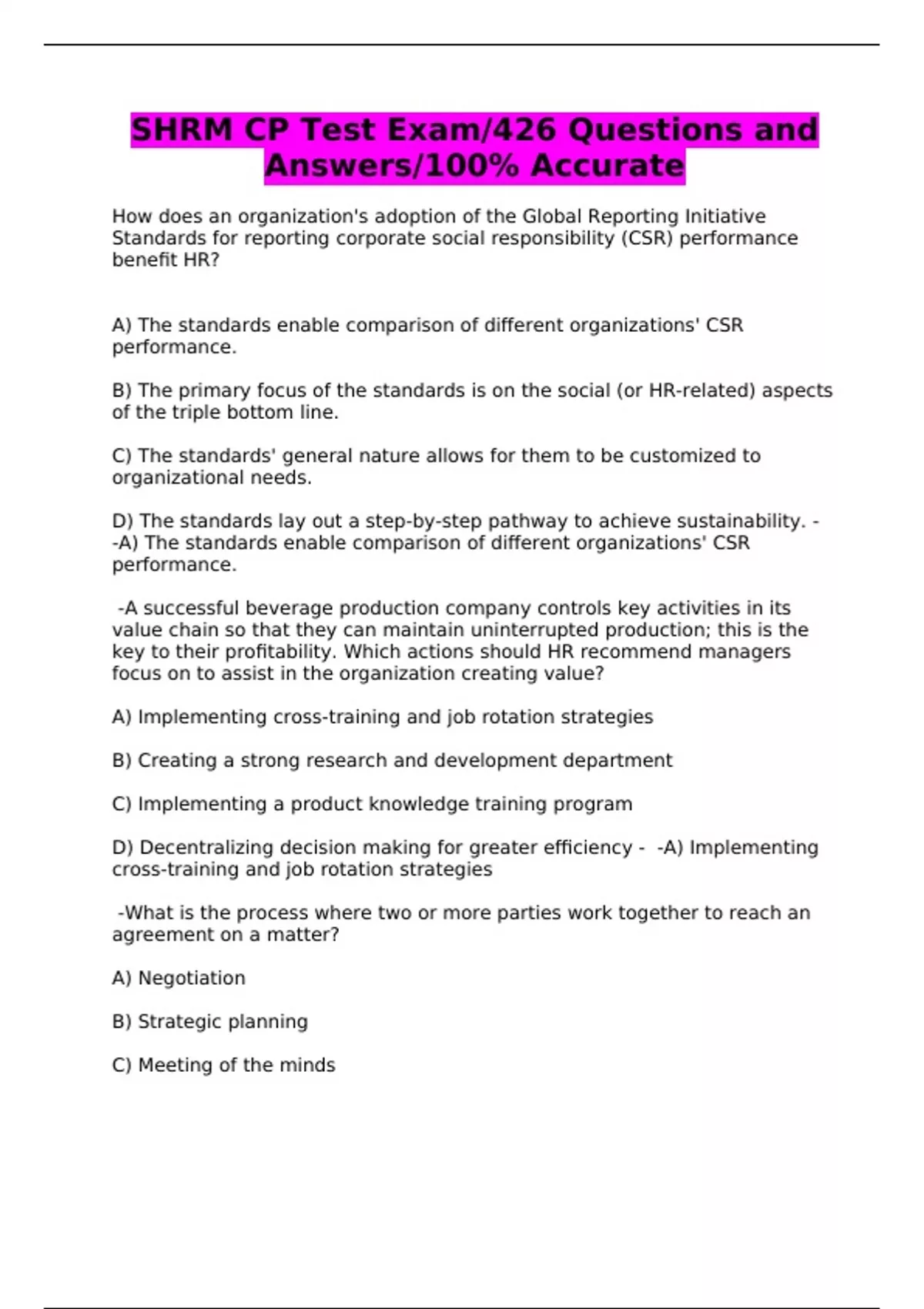 SHRM CP Test Exam/426 Questions and Answers/100% Accurate