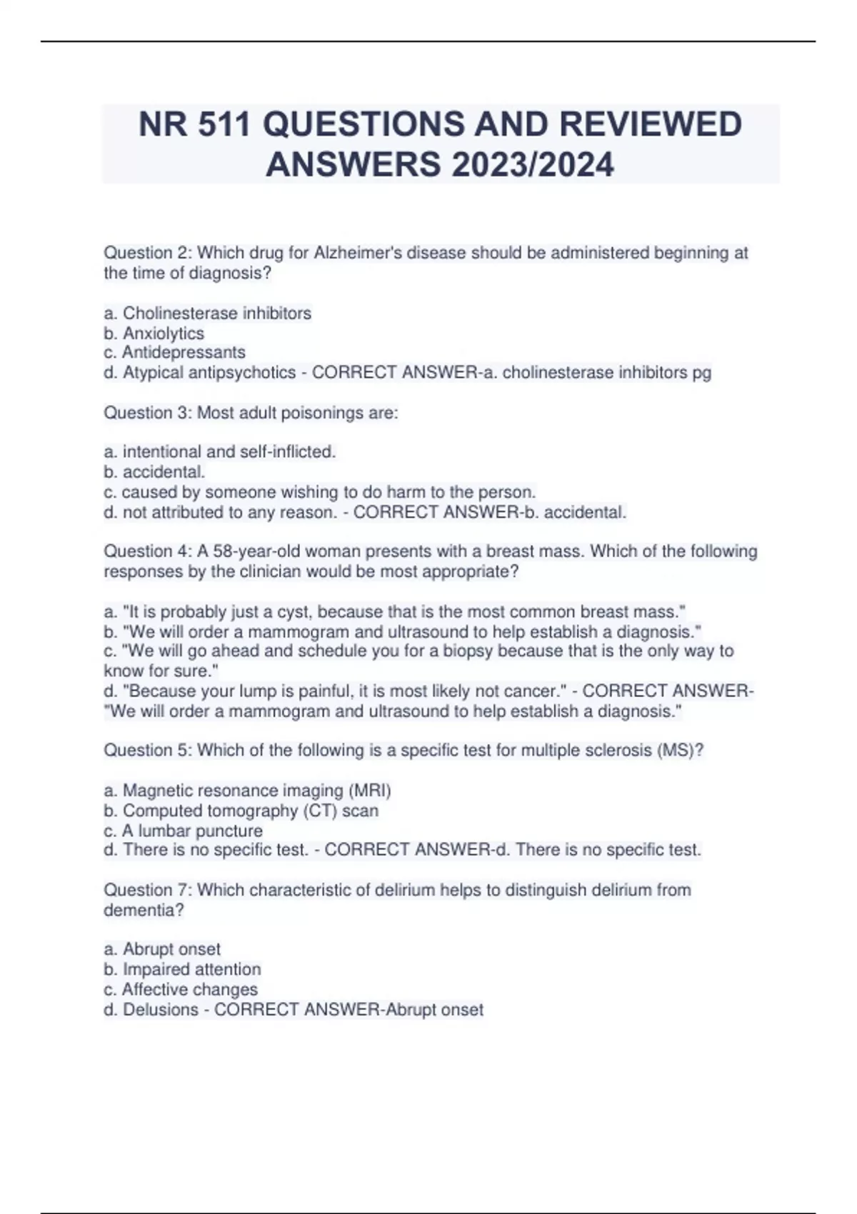 NR 511 QUESTIONS AND REVIEWED ANSWERS 2023/2024 Question 2: Which drug for Alzheimer's disease should be administered beginning at the time of diagnosis? a. Cholinesterase inhibitors b. Anxiolytics c. Antidepressants d. Atypical antipsychotics - CORRECT ANSWER-a. cholinesterase inhibitors pg Question 3: Most adult poisonings are: a. intentional and self-inflicted. b. accidental. c. caused by someone wishing to do harm to the person. d. not attributed to any reason. - CORRECT ANSWER-b. accidental. Question 4: A 58-year-old woman presents with a breast mass. Which of the following responses by the clinician would be most appropriate? a. "It is probably just a cyst, because that is the most common breast mass." b. "We will order a mammogram and ultrasound to help establish a diagnosis." c. "We will go ahead and schedule you for a biopsy because that is the only way to know for sure." d. "Because your lump is painful, it is most likely not cancer." - CORRECT ANSWER- "We will order a mammogram and ultrasound to help establish a diagnosis." Question 5: Which of the following is a specific test for multiple sclerosis (MS)? a. Magnetic resonance imaging (MRI) b. Computed tomography (CT) scan c. A lumbar puncture d. There is no specific test. - CORRECT ANSWER-d. There is no specific test. Question 7: Which characteristic of delirium helps to distinguish delirium from dementia? a. Abrupt onset b. Impaired attention c. Affective changes d. Delusions - CORRECT ANSWER-Abrupt onset Question 8: Which clinical feature is the first to be affected in increased intracranial pressure (ICP)? a. Decrease in level of consciousness (LOC) b. Headache c. Nausea d. Widening pulse pressure - CORRECT ANSWER-Decrease in level of consciousness (LOC) Question 9: Jennifer is an 18-year-old girl who comes to the emergency room after a fall during a soccer game. Jennifer explains that she fell on her left side and kept her arm out straight to break her fall. She has been experiencing severe pain and limited range of motion in her left shoulder. The clinician has diagnosed Jennifer with a dislocated shoulder. Which of the following statements are true concerning shoulder dislocation? a. Posterior dislocations are more common than anterior dislo - CORRECT ANSWERThere is a risk of neurovascular and neurosensory trauma, so the clinician should check for distal pulses. Question 10: Which of the following signs or symptoms indicate an inflammatory etiology to musculoskeletal pain? a. Decreased C-reactive protein b. Hyperalbuminemia c. Morning stiffness d. Weight gain - CORRECT ANSWER-morning stiffness Question 11: The clinician sees a patient who is 5 feet tall and weighs 150 pounds. How would the clinician classify this patient? a. Overweight b. Mild obesity c. Moderate obesity d. Morbid obesity - CORRECT ANSWER-Mild obesity Question 13: A 23-year-old sexually active woman presents for her first Pap smear. Her history includes nulligravida, age at first intercourse 14, and more than 10 sexual partners. Which of the following conditions should the clinician be particularly alert for during her exam? a. Human papillomavirus (HPV) b. Endometrial hyperplasia c. Vagismus d. Polycystic ovarian syndrome - CORRECT ANSWER-Human papillomavirus (HPV) Question 14: Which of the following classes of drugs should be used as first-line therapy for treatment of delirium? a. Benzodiazepines b. Antipsychotics c. Anticonvulsants d. Antidepressants - CORRECT ANSWER-Antipsychotic Question 15: What is the treatment of choice for a patient diagnosed with testicular cancer? a. Radical orchidectomy b. Lumpectomy c. Radiation implants d. All of the above - CORRECT ANSWER-treatment of choice for a patient diagnosed with testicular cancer? Radical orchidectomy Question 16: A 24-year-old woman presents to the clinic with dysuria, dyspareunia, and a mucopurulent vaginal discharge. Her boyfriend was recently treated for nongonococcal urethritis. What sexually transmitted disease (STD) has she most probably been exposed to? a. Gonorrhea b. Human papillomavirus (HPV) c. Chlamydia d. Trichomonas - CORRECT ANSWER-Chlamydia Question 17: A 58-year-old woman who had a total abdominal hysterectomy at the age of 45 is diagnosed with atrophic vaginitis. Which of the following is the most appropriate treatment? a. Conjugated estrogen 0.625 mg/day oral b. Estradiol 7.5 mcg/24 hr vaginal ring c. Medroxyprogesterone 10 mg/day oral d. Conjugated estrogen 0.3 mg + medroxyprogesterone 1.5 mg/day oral - CORRECT ANSWER-Estradiol 7.5 mcg/24 hr vaginal ring Question 18: When looking under the microscope to diagnose an intravaginal infection, you see a cluster of small and oval to round shapes. What do you suspect they are? a. Spores