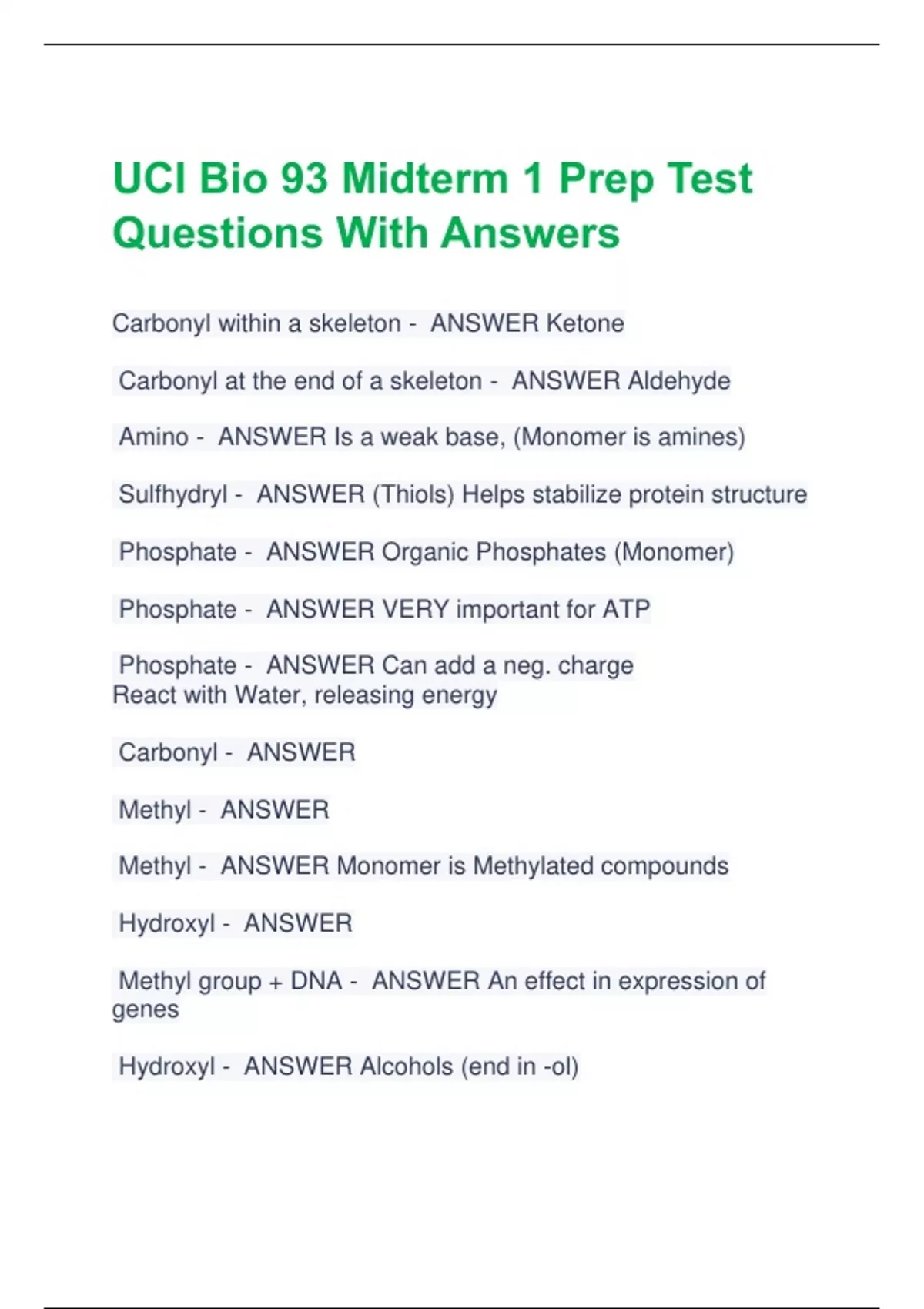UCI Bio 93 Midterm 1 Prep Test Questions With Answers Carbonyl within a skeleton - ANSWER Ketone Carbonyl at the end of a skeleton - ANSWER Aldehyde Amino - ANSWER Is a weak base, (Monomer is amines) Sulfhydryl - ANSWER (Thiols) Helps stabilize protein structure Phosphate - ANSWER Organic Phosphates (Monomer) Phosphate - ANSWER VERY important for ATP Phosphate - ANSWER Can add a neg. charge React with Water, releasing energy Carbonyl - ANSWER Methyl - ANSWER Methyl - ANSWER Monomer is Methylated compounds Hydroxyl - ANSWER Methyl group + DNA - ANSWER An effect in expression of genes Hydroxyl - ANSWER Alcohols (end in -ol) Hydroxyl - ANSWER Covalently bonded to Carbon Soluble in Water Phosphate - ANSWER Amino - ANSWER Carboxyl - ANSWER Carboxyl - ANSWER Organic Acids Carboxyl - ANSWER Polar Covalent bond between O and H Sulfhydryl - ANSWER Intermolecular - ANSWER Intramolecular - ANSWER What bond links two monosaccharides together? - ANSWER Glycosidic Linkage Macromolecules - ANSWER Carbohydrates, Nucleic Acids, Lipids, Proteins Phospholipid Bilayer - ANSWER Diffusion - ANSWER The movement of particles of any substance so that they spread out into the available space. Passive Transport - ANSWER The diffusion of a substance across a biological membrane Osmosis - ANSWER The diffusion of free water across a selectively permeable membrane (Artificial or Cellular) Tonicity - ANSWER The ability of a surrounding solution to cause a cell to gain or lose water Isotonic - ANSWER No net movement of water across the plasma membrane. Hypertonic Solution - ANSWER Hypotonic Solution - ANSWER Plasmolysis - ANSWER Facilitated Diffusion - ANSWER Active Transport - ANSWER When a cell uses energy to pump a solute across a membrane. Lyse - ANSWER Burst Phagocytosis - ANSWER A cell engulfs a particle Pinocytosis - ANSWER a cell continually "gulfs" droplets of extracellular fluids into tiny vesicles. Isotonic Solution - ANSWER