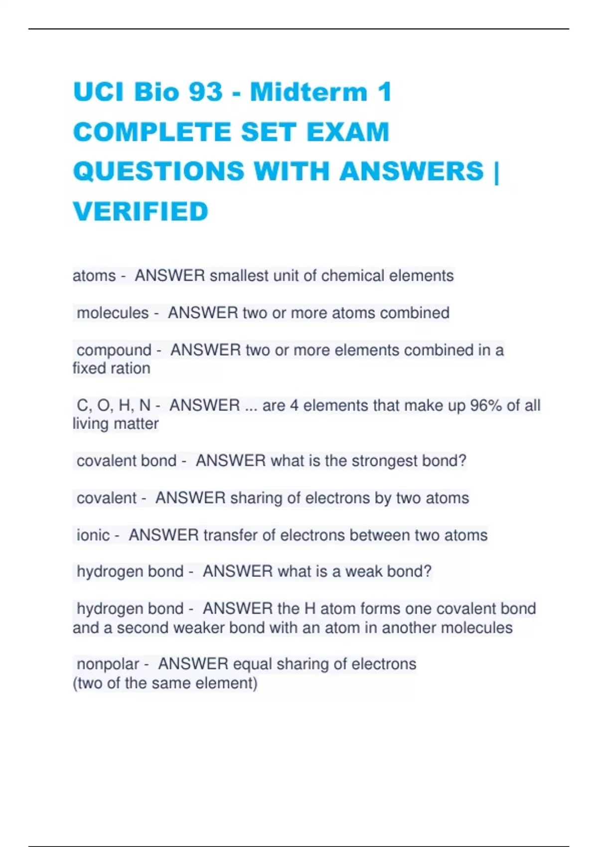 UCI Bio 93 - Midterm 1 COMPLETE SET EXAM QUESTIONS WITH ANSWERS | VERIFIED atoms - ANSWER smallest unit of chemical elements molecules - ANSWER two or more atoms combined compound - ANSWER two or more elements combined in a fixed ration C, O, H, N - ANSWER ... are 4 elements that make up 96% of all living matter covalent bond - ANSWER what is the strongest bond? covalent - ANSWER sharing of electrons by two atoms ionic - ANSWER transfer of electrons between two atoms hydrogen bond - ANSWER what is a weak bond? hydrogen bond - ANSWER the H atom forms one covalent bond and a second weaker bond with an atom in another molecules nonpolar - ANSWER equal sharing of electrons (two of the same element) polar - ANSWER unequal sharing of electrons has a charge (water) negative - ANSWER what is the charge of O in water? positive - ANSWER what is the charge of H in water? cohesion - ANSWER interactions between water molecules (H2O with H2O) solvent - ANSWER interactions between water and other molecules 4 bonds - ANSWER what is the maximum amount of bonds that hydrogen can form? 15% - ANSWER in room temperature of water what % is the maximum amount of bonds going to be made? more acidic - ANSWER when H+ concentration increases... more basic - ANSWER what H- concentration decreases... hydrophilic - ANSWER affinity for water (polar and ionic bonds) hydrophobic - ANSWER repel water (nonpolar covalent bonds) buffers - ANSWER chemical processes are sensitive to pH changes and resist change in the pH solution 7.4 - ANSWER the pH of human blood is... carbonic acid and bicarbonate - ANSWER what are the main buffers in blood? right - ANSWER response to a rise in pH in blood (becomes more basic) left - ANSWER response to a drop in pH in blood (becomes more acidic) carbon atoms - ANSWER building blocks for biological molecules 4 VE - ANSWER how many VE does carbon have? covalent bonds - ANSWER how do functional groups join to the carbon skeleton? hydroxyl - ANSWER -alcohols -polar -dissolves organic compounds (like sugars) carbonyl - ANSWER -ketones (within skeleton) -aldehydes (at the end of skeleton)