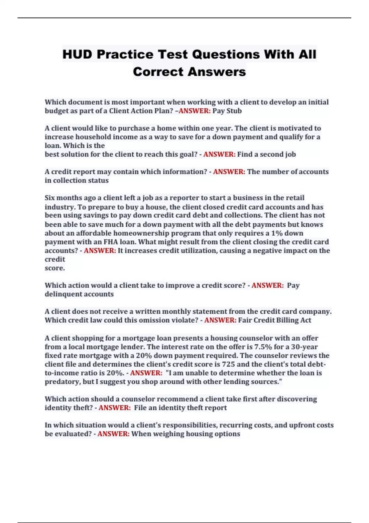 HUD Practice Test Questions With All Correct Answers
