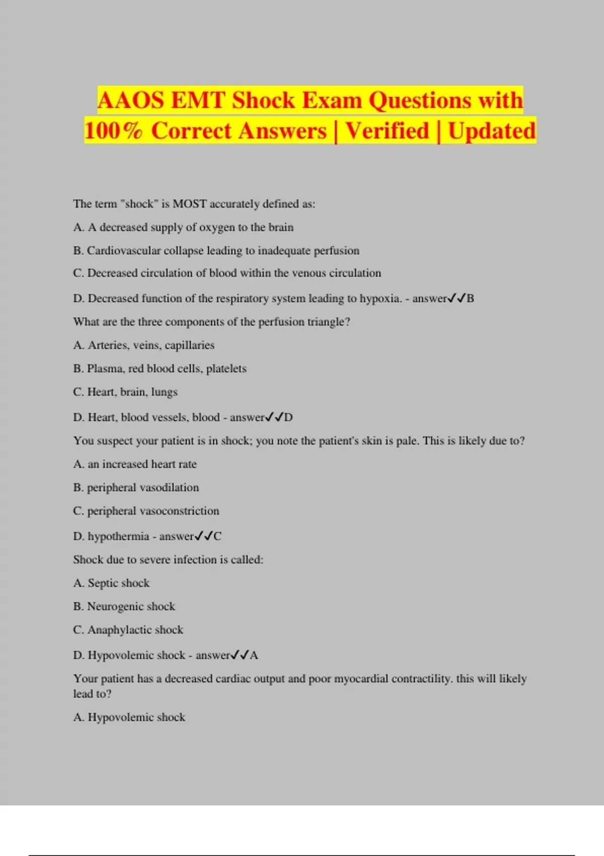 AAOS EMT Shock Exam Questions with 100% Correct Answers | Verified | Updated The term "shock" is MOST accurately defined as: A. A decreased supply of oxygen to the brain B. Cardiovascular collapse leading to inadequate perfusion C. Decreased circulation of blood within the venous circulation D. Decreased function of the respiratory system leading to hypoxia. - answerB What are the three components of the perfusion triangle? A. Arteries, veins, capillaries B. Plasma, red blood cells, platelets C. Heart, brain, lungs D. Heart, blood vessels, blood - answerD You suspect your patient is in shock; you note the patient's skin is pale. This is likely due to? A. an increased heart rate B. peripheral vasodilation C. peripheral vasoconstriction D. hypothermia - answerC Shock due to severe infection is called: A. Septic shock B. Neurogenic shock C. Anaphylactic shock D. Hypovolemic shock - answerA Your patient has a decreased cardiac output and poor myocardial contractility. this will likely lead to? A. Hypovolemic shock B. Cardiogenic shock C. Neurogenic shock D. Septic shock - answerB Foods, medications, and insects are common causes of: A. Septic shock B. Anaphylactic shock C. Cardiogenic shock D. Neurogenic shock - answerB Anaphylactic shock is typically associated with: A. Urticaria B. Bradycardia C. Localized welts D. A severe headache - answerA If a patient in shock is able to maintain perfusion, then this is: A. Irreversible shock. B. Physiological shock. C. Compensated shock. D. Decompensated shock. - answerC As you approach a patient lying at the side of the roadway, you observe severe bleeding from the leg. What should your first action be? A. Open the airway. B. Control the bleeding. C. Administer oxygen. D. Check for a pulse - answerB When should non-lifesaving interventio