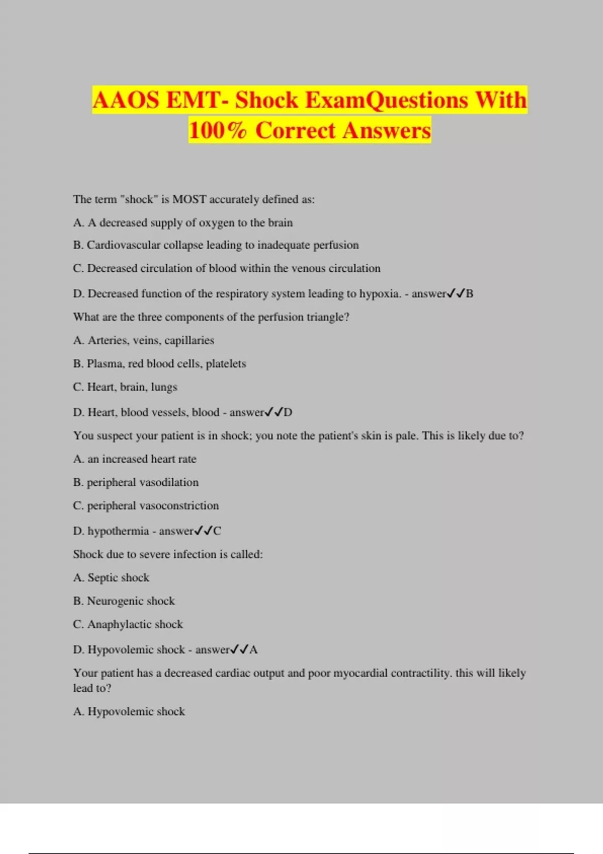 AAOS EMT- Shock ExamQuestions With 100% Correct Answers The term "shock" is MOST accurately defined as: A. A decreased supply of oxygen to the brain B. Cardiovascular collapse leading to inadequate perfusion C. Decreased circulation of blood within the venous circulation D. Decreased function of the respiratory system leading to hypoxia. - answerB What are the three components of the perfusion triangle? A. Arteries, veins, capillaries B. Plasma, red blood cells, platelets C. Heart, brain, lungs D. Heart, blood vessels, blood - answerD You suspect your patient is in shock; you note the patient's skin is pale. This is likely due to? A. an increased heart rate B. peripheral vasodilation C. peripheral vasoconstriction D. hypothermia - answerC Shock due to severe infection is called: A. Septic shock B. Neurogenic shock C. Anaphylactic shock D. Hypovolemic shock - answerA Your patient has a decreased cardiac output and poor myocardial contractility. this will likely lead to? A. Hypovolemic shock B. Cardiogenic shock C. Neurogenic shock D. Septic shock - answerB Foods, medications, and insects are common causes of: A. Septic shock B. Anaphylactic shock C. Cardiogenic shock D. Neurogenic shock - answerB Anaphylactic shock is typically associated with: A. Urticaria B. Bradycardia C. Localized welts D. A severe headache - answerA If a patient in shock is able to maintain perfusion, then this is: A. Irreversible shock. B. Physiological shock. C. Compensated shock. D. Decompensated shock. - answerC As you approach a patient lying at the side of the roadway, you observe severe bleeding from the leg. What should your first action be? A. Open the airway. B. Control the bleeding. C. Administer oxygen. D. Check for a pulse - answerB When should non-lifesaving interventio
