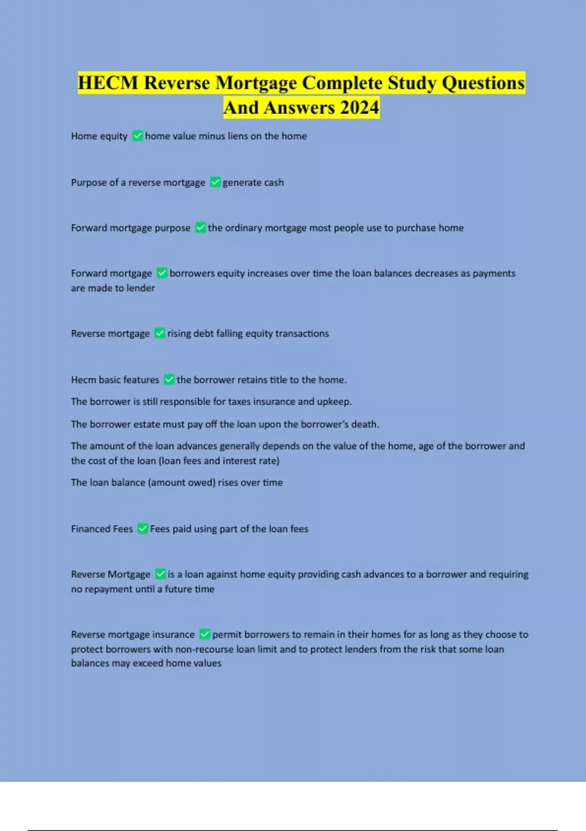 HECM Reverse Mortgage Complete Study Questions And Answers 2024 HECM Reverse Mortgage Complete Study Questions And Answers 2024