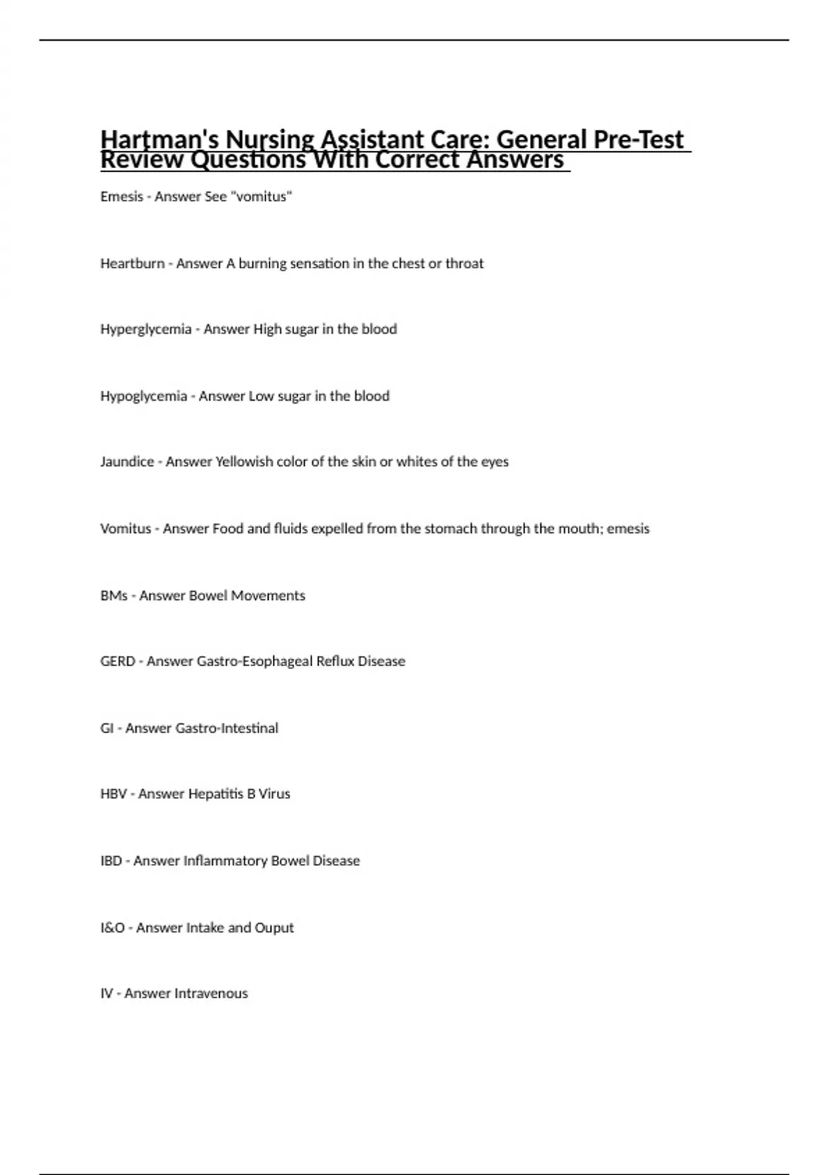 Hartman's Nursing Assistant Care: General Pre-Test Review Questions With Correct Answers