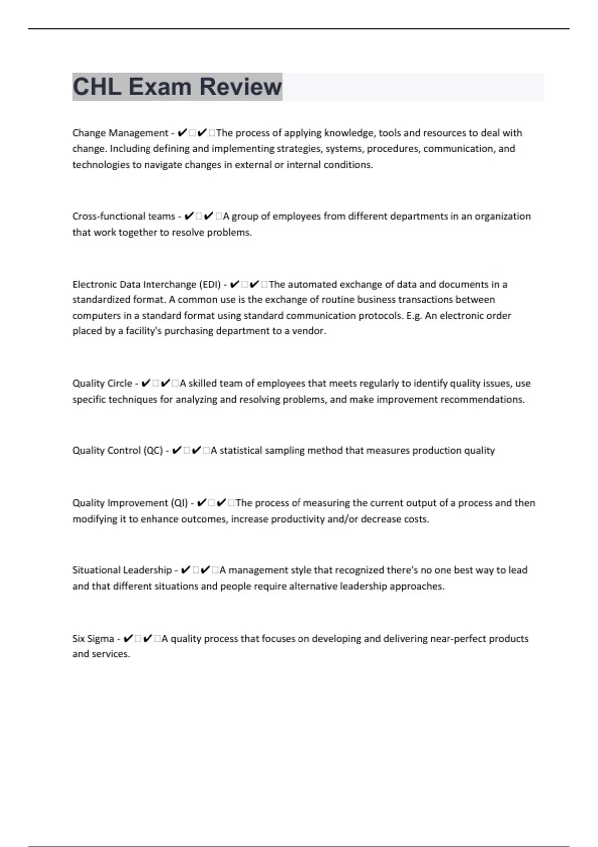 Change Management - ️️The process of applying knowledge, tools and resources to deal with change. Including defining and implementing strategies, systems, procedures, communication, and technologies to navigate changes in external or internal conditions. Cross-functional teams - ️️A group of employees from different departments in an organization that work together to resolve problems. Electronic Data Interchange (EDI) - ️️The automated exchange of data and documents in a standardized format. A common use is the exchange of routine business transactions between computers in a standard format using standard communication protocols. E.g. An electronic order placed by a facility's purchasing department to a vendor. Quality Circle - ️️A skilled team of employees that meets regularly to identify quality issues, use specific techniques for analyzing and resolving problems, and make improvement recommendations. Quality Control (QC) - ️️A statistical sampling method that measures production quality Quality Improvement (QI) - ️️The process of measuring the current output of a process and then modifying it to enhance outcomes, increase productivity and/or decrease costs. Situational Leadership - ️️A management style that recognized there's no one best way to lead and that different situations and people require alternative leadership approaches. Six Sigma - ️️A quality process that focuses on developing and delivering near-perfect products and services.