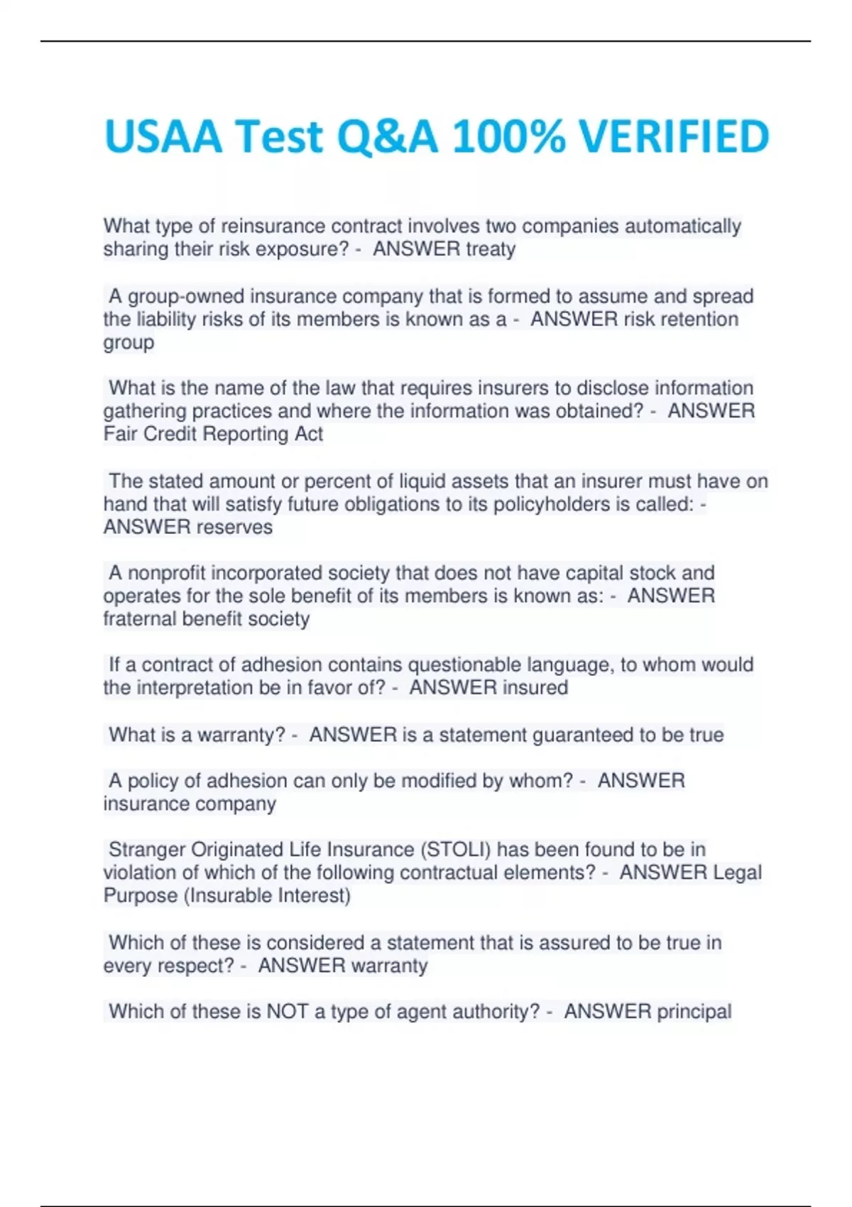 USAA Test Q&A 100% VERIFIED What type of reinsurance contract involves two companies automatically sharing their risk exposure? - ANSWER treaty A group-owned insurance company that is formed to assume and spread the liability risks of its members is known as a - ANSWER risk retention group What is the name of the law that requires insurers to disclose information gathering practices and where the information was obtained? - ANSWER Fair Credit Reporting Act The stated amount or percent of liquid assets that an insurer must have on hand that will satisfy future obligations to its policyholders is called: - ANSWER reserves A nonprofit incorporated society that does not have capital stock and operates for the sole benefit of its members is known as: - ANSWER fraternal benefit society If a contract of adhesion contains questionable language, to whom would the interpretation be in favor of? - ANSWER insured What is a warranty? - ANSWER is a statement guaranteed to be true A policy of adhesion can only be modified by whom? - ANSWER insurance company Stranger Originated Life Insurance (STOLI) has been found to be in violation of which of the following contractual elements? - ANSWER Legal Purpose (Insurable Interest) Which of these is considered a statement that is assured to be true in every respect? - ANSWER warranty Which of these is NOT a type of agent authority? - ANSWER principal The Consideration clause of an insurance contract includes: - ANSWER the schedule and amount of premium payments What is the consideration given by an insurer in the Consideration clause of the life policy? - ANSWER Promise to pay a death benefit to a named beneficiary Who makes the legally enforceable promises in a unilateral insurance policy? - ANSWER insurance company All of the following are considered to be typical characteristics describing the nature of an insurance contract, EXCEPT: - ANSWER bilateral At what point does an informal contact become binding? - ANSWER When one party makes an offer and the other party accepts that offer. Which of these arrangements allows one to bypass insurable interest laws? - ANSWER Investor-Originated Life Insurance Taking receipt of premiums and holding them for the insurance company is an example of - ANSWER fiduciary responsibility Life and health insurance policies are: - ANSWER unilateral contracts What type of life insurance gives the greatest amount of coverage for a limited period of time? - ANSWER Term life Which type of life policy contains a monthly mortality charge as well as self-directed investment choices? - ANSWER Variable Universal Life T has a term policy that allows him to continue the coverage after expiration of the initial policy period. What type of term coverage is this? - ANSWER renewable Which of the following policies is characterized by a flexible premium and death benefit and allows the policyowner control of the investment aspect of the plan? - ANSWER Variable universal life D needs life insurance that provides coverage for only a limited amount of time while also paying the lowest possible premium. What kind of policy is needed? - ANSWER Level term A policy that becomes a Modified Endowment Contract (MEC) - ANSWER will lose many of its tax advantages Term insurance has which of the following characteristics? - ANSWER Expires at the end of the policy period What type of life policy covers two people and pays upon death of the last insured? - ANSWER survivorship A father who dies within 3 years after purchasing a life insurance policy on his infant daughter can have the policy premiums waived under which provision? - ANSWER Payor provision G purchased a Family Income policy at age 40. The policy has a 20-year rider period. If G were to die at age 50, how long would G's family receive an income? - ANSWER 10 years A potential client, age 40, would like to purchase a Whole Life policy that will accumulate cash value at a faster rate in the early years of the policy. Which of these statements made by the producer would be correct? - ANSWER 20-Pay Life accumulates cash value faster than Straight Life Which statement is TRUE regarding a Variable Whole Life Policy? - ANSWER A minimum guaranteed Death benefit is provided N is a 40-year old applicant who would like to retire at age 70. He is looking to buy a life insurance policy with level premiums, permanent protection, and be paid-up at retirement. Which of these should N purchase? - ANSWER 30 Pay Life