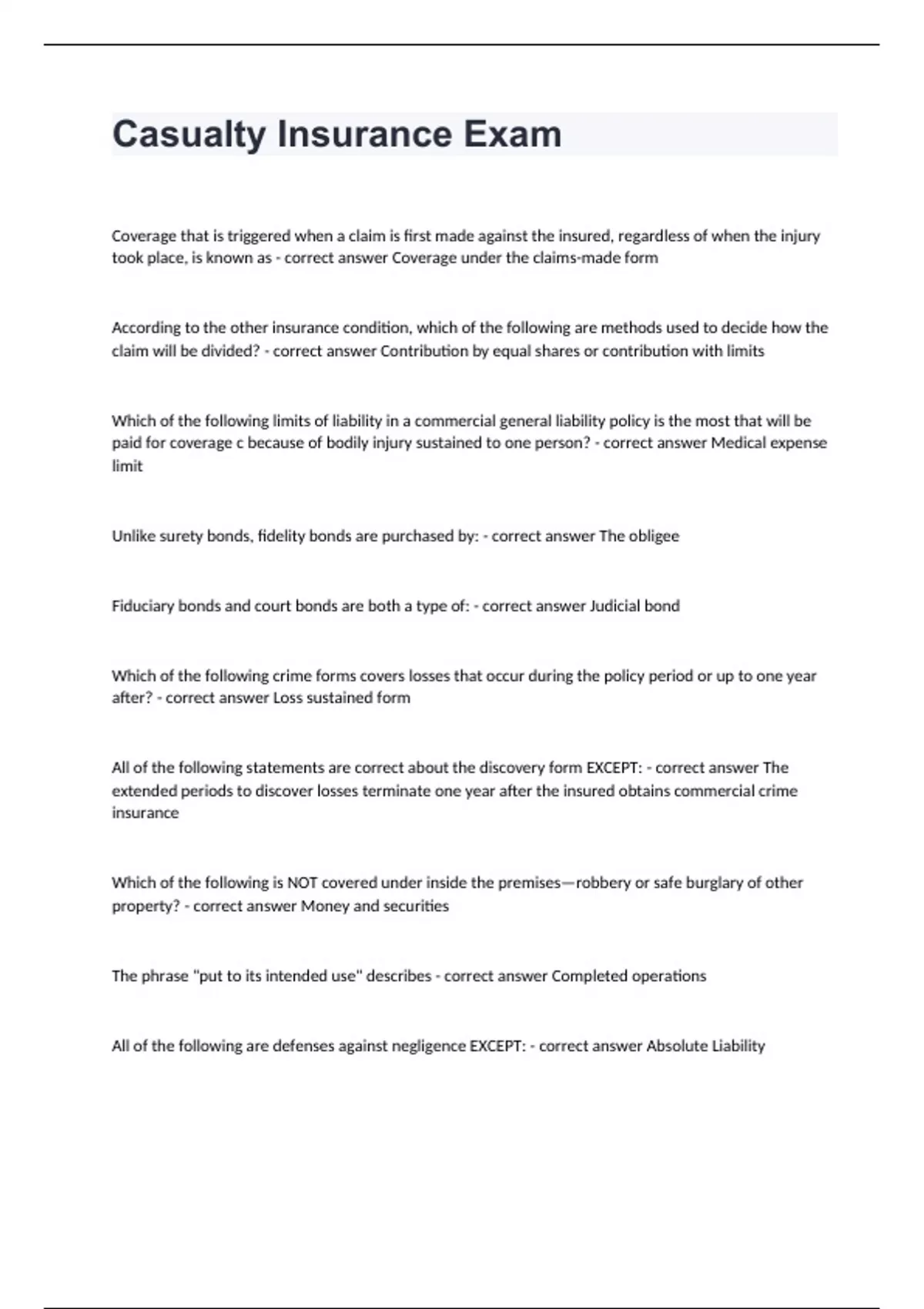 Casualty Insurance Exam Coverage that is triggered when a claim is first made against the insured, regardless of when the injury took place, is known as - correct answer Coverage under the claims-made form According to the other insurance condition, which of the following are methods used to decide how the claim will be divided? - correct answer Contribution by equal shares or contribution with limits Which of the following limits of liability in a commercial general liability policy is the most that will be paid for coverage c because of bodily injury sustained to one person? - correct answer Medical expense limit Unlike surety bonds, fidelity bonds are purchased by: - correct answer The obligee Fiduciary bonds and court bonds are both a type of: - correct answer Judicial bond Which of the following crime forms covers losses that occur during the policy period or up to one year after? - correct answer Loss sustained form All of the following statements are correct about the discovery form EXCEPT: - correct answer The extended periods to discover losses terminate one year after the insured obtains commercial crime insurance Which of the following is NOT covered under inside the premises—robbery or safe burglary of other property? - correct answer Money and securities The phrase "put to its intended use" describes - correct answer Completed operations All of the following are defenses against negligence EXCEPT: - correct answer Absolute Liability