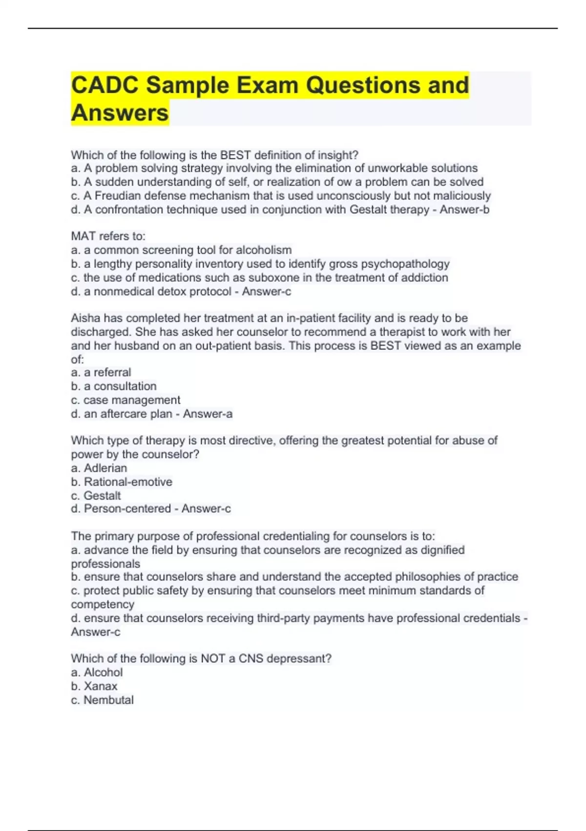 CADC Sample Exam Questions and Answers Which of the following is the BEST definition of insight? a. A problem solving strategy involving the elimination of unworkable solutions b. A sudden understanding of self, or realization of ow a problem can be solved c. A Freudian defense mechanism that is used unconsciously but not maliciously d. A confrontation technique used in conjunction with Gestalt therapy - Answer-b MAT refers to: a. a common screening tool for alcoholism b. a lengthy personality inventory used to identify gross psychopathology c. the use of medications such as suboxone in the treatment of addiction d. a nonmedical detox protocol - Answer-c Aisha has completed her treatment at an in-patient facility and is ready to be discharged. She has asked her counselor to recommend a therapist to work with her and her husband on an out-patient basis. This process is BEST viewed as an example of: a. a referral b. a consultation c. case management d. an aftercare plan - Answer-a Which type of therapy is most directive, offering the greatest potential for abuse of power by the counselor? a. Adlerian b. Rational-emotive c. Gestalt d. Person-centered - Answer-c The primary purpose of professional credentialing for counselors is to: a. advance the field by ensuring that counselors are recognized as dignified professionals b. ensure that counselors share and understand the accepted philosophies of practice c. protect public safety by ensuring that counselors meet minimum standards of competency d. ensure that counselors receiving third-party payments have professional credentials - Answer-c Which of the following is NOT a CNS depressant? a. Alcohol b. Xanax c. Nembutal d. Benzedrine - Answer-d The concept of informed consent requires that before agreeing to accept treatment, clients should know their rights and obligations, therapeutic goals, fees for services and a. availability of referral services b. community resources to be used c. with whom they will be participating in group activities d. the limits of their confidentiality - Answer-d Attitudes, policies, and practices that are destructive to other cultures and their members are examples of lack of cultural a. blindness b. competence c. destructiveness d. incapacity - Answer-b Restlessness, nervousness, flushed face, muscle twitching, tachycardia, or cardiac arrhythmia are all signs or symptoms of: a. caffeine intoxication b. cocaine intoxication c. alcohol intoxication d. opioid intoxication - Answer-a Of all of the possible substance use disorders, which one is typically not seen in older children or adults? a. cannabis use disorder b. inhalant use disorder c. tobacco use disorder d. caffeine use disorder - Answer-b
