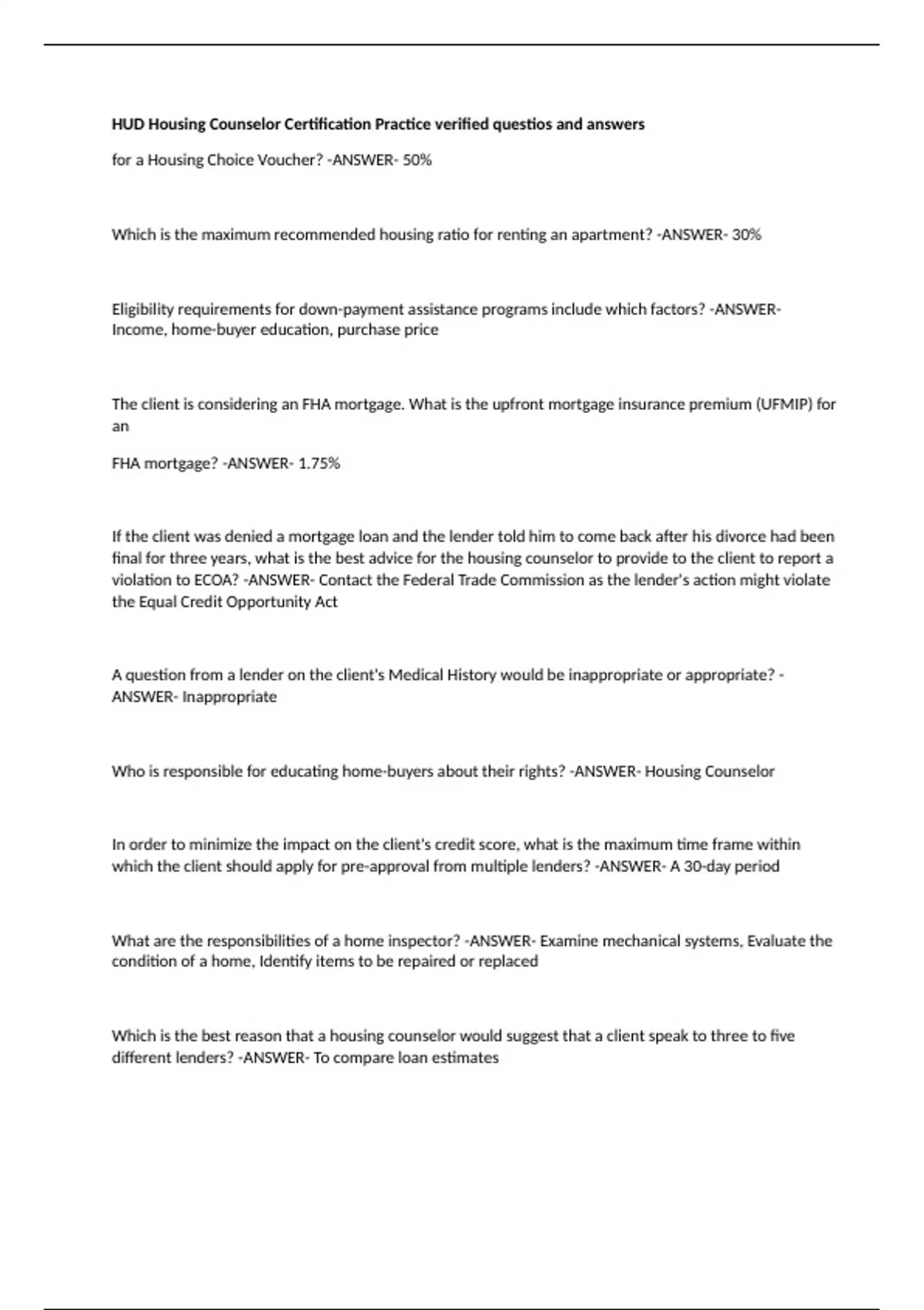 The client is considering an FHA mortgage. What is the upfront mortgage insurance premium (UFMIP) for an FHA mortgage? -ANSWER- 1.75% If the client was denied a mortgage loan and the lender told him to come back after his divorce had been final for three years, what is the best advice for the housing counselor to provide to the client to report a violation to ECOA? -ANSWER- Contact the Federal Trade Commission as the lender's action might violate the Equal Credit Opportunity Act A question from a lender on the client's Medical History would be inappropriate or appropriate? -ANSWER- Inappropriate Who is responsible for educating home-buyers about their rights? -ANSWER- Housing Counselor In order to minimize the impact on the client's credit score, what is the maximum time frame within which the client should apply for pre-approval from multiple lenders? -ANSWER- A 30-day period What are the responsibilities of a home inspector? -ANSWER- Examine mechanical systems, Evaluate the condition of a home, Identify items to be repaired or replaced Which is the best reason that a housing counselor would suggest that a client speak to three to five different lenders? -ANSWER- To compare loan estimates Which is the best advice that a housing counselor can give the client to protect against identity theft? -ANSWER- Review credit report at least once per year The client tells the lender that he is expecting a raise soon. Should the Lender provide a Loan Estimate (LE) with, or without factoring the raise? -ANSWER- Provide a loan estimate without factoring in the raise If this client obtains a mortgage of $100,000, typically, how much should he expect to pay for closing costs? -ANSWER- $3000 to $4000 Is Application Fee an upfront cost of clients who are considering renting or buying a property? -ANSWER- Renting A client wants to customize his home with do-it-yourself projects, this is an indication the client is best aligned with which housing option; Home-ownership or Renting? -ANSWER- Home-ownership