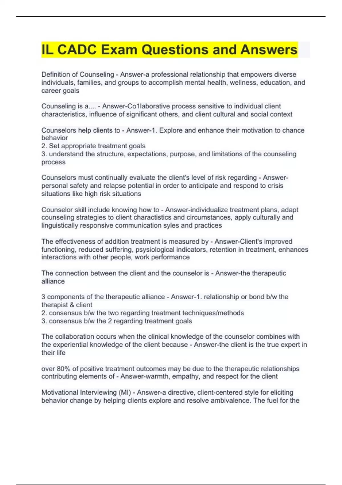 IL CADC Exam Questions and Answers Definition of Counseling - Answer-a professional relationship that empowers diverse individuals, families, and groups to accomplish mental health, wellness, education, and career goals Counseling is a.... - Answer-Co1laborative process sensitive to individual client characteristics, influence of significant others, and client cultural and social context Counselors help clients to - Answer-1. Explore and enhance their motivation to chance behavior 2. Set appropriate treatment goals 3. understand the structure, expectations, purpose, and limitations of the counseling process Counselors must continually evaluate the client's level of risk regarding - Answer-personal safety and relapse potential in order to anticipate and respond to crisis situations like high risk situations Counselor skill include knowing how to - Answer-individualize treatment plans, adapt counseling strategies to client charactistics and circumstances, apply culturally and linguistically responsive communication syles and practices The effectiveness of addition treatment is measured by - Answer-Client's improved functioning, reduced suffering, psysiological indicators, retention in treatment, enhances interactions with other people, work performance The connection between the client and the counselor is - Answer-the therapeutic alliance 3 components of the therapeutic alliance - Answer-1. relationship or bond b/w the therapist & client 2. consensus b/w the two regarding treatment techniques/methods 3. consensus b/w the 2 regarding treatment goals The collaboration occurs when the clinical knowledge of the counselor combines with the experiential knowledge of the client because - Answer-the client is the true expert in their life over 80% of positive treatment outcomes may be due to the therapeutic relationships contributing elements of - Answer-warmth, empathy, and respect for the client Motivational Interviewing (MI) - Answer-a directive, client-centered style for eliciting behavior change by helping clients explore and resolve ambivalence. The fuel for the chamce process is the client's motivation to make the change. Can enhance motivations starting at the screening and lasting through the treatment process