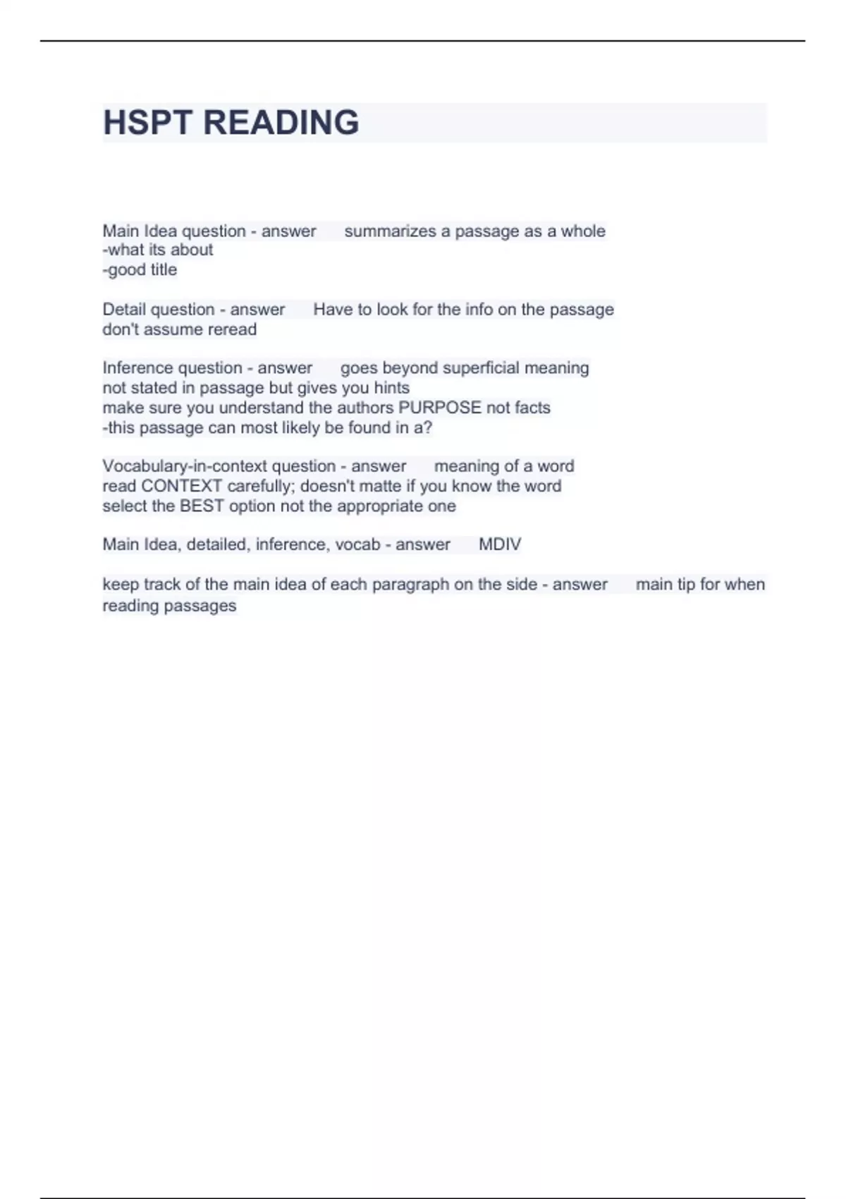 Exam of 1 pages for the course HSPT at HSPT (HSPT READING)