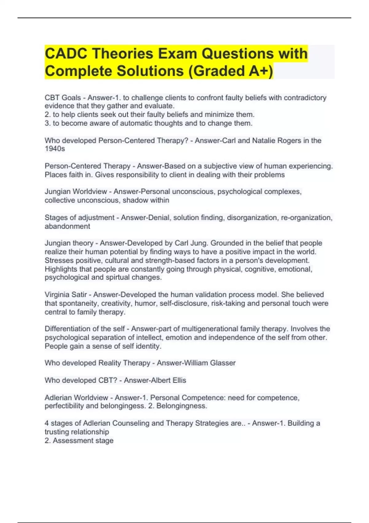 CADC Theories Exam Questions with Complete Solutions (Graded A+) CBT Goals - Answer-1. to challenge clients to confront faulty beliefs with contradictory evidence that they gather and evaluate. 2. to help clients seek out their faulty beliefs and minimize them. 3. to become aware of automatic thoughts and to change them. Who developed Person-Centered Therapy? - Answer-Carl and Natalie Rogers in the 1940s Person-Centered Therapy - Answer-Based on a subjective view of human experiencing. Places faith in. Gives responsibility to client in dealing with their problems Jungian Worldview - Answer-Personal unconscious, psychological complexes, collective unconscious, shadow within Stages of adjustment - Answer-Denial, solution finding, disorganization, re-organization, abandonment Jungian theory - Answer-Developed by Carl Jung. Grounded in the belief that people realize their human potential by finding ways to have a positive impact in the world. Stresses positive, cultural and strength-based factors in a person's development. Highlights that people are constantly going through physical, cognitive, emotional, psychological and spirtual changes. Virginia Satir - Answer-Developed the human validation process model. She believed that spontaneity, creativity, humor, self-disclosure, risk-taking and personal touch were central to family therapy. Differentiation of the self - Answer-part of multigenerational family therapy. Involves the psychological separation of intellect, emotion and independence of the self from other. People gain a sense of self identity. Who developed Reality Therapy - Answer-William Glasser Who developed CBT? - Answer-Albert Ellis Adlerian Worldview - Answer-1. Personal Competence: need for competence, perfectibility and belongingess. 2. Belongingness. 4 stages of Adlerian Counseling and Therapy Strategies are.. - Answer-1. Building a trusting relationship 2. Assessment stage 3. Promoting insight 4. Reorientation 4 Jungian Counseling and Therapy Strategies are... - Answer-1. Catharsis and Emotional cleansing 2. Elucidation 3. Education 4. Transformation Rational-Emotive-Behavioral Therapy (REBT) - Answer-Based on the principle that people are not disturbed by events but rather how they see the event. Attitudes & negative self-concepts can start& maintain the process of addiction. REBT concentrates on the here and now rather than the past as to how a person's attitudes, beliefs & self-concepts affect their emotions & behavior. One of the beliefs of this model is that motivations that caused self defeating behaviors of chemical addictions are discomfort, anxiety, & low frustration tolerance. The counselor's job is to help the patient replace these behaviors with rational behaviors.