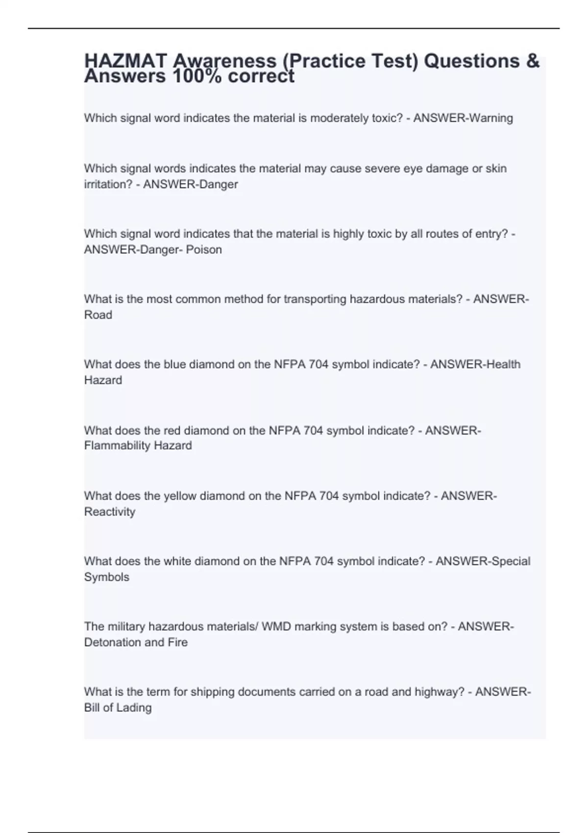 HAZMAT Awareness (Practice Test) Questions & Answers 100% correct