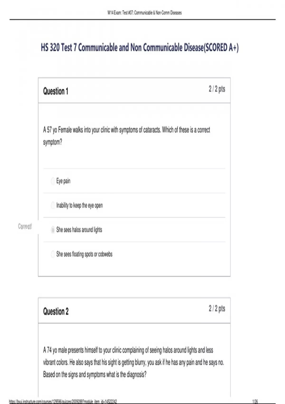 HS 320 Test 7 Communicable and Non Communicable Disease(SCORED A+) Correct! She sees floating spots or cobwebs She sees halos around lights Inability to keep the eye open Eye pain A 57 yo Female walks into your clinic with symptoms of cataracts. Which of these is a correct symptom? Question 1 2 / 2 pts A 74 yo male presents himself to your clinic complaining of seeing halos around lights and less vibrant colors. He also says that his sight is getting blurry, you ask if he has any pain and he says no. Based on the signs and symptoms what is the diagnosis? Question 2 / 2 pts 2 W14 Exam: Test #07: Communicable & Non-Comm Diseases HS 320 Test 7 Communicable and Non Communicable Disease(SCORED A+) You Answered Correct Answe Glaucoma Macular Degeneration r Strabismus Retinal Detachment A loss of central vision and sharp vision, are symptoms of which disease? Question 0 / 2 pts 3 Correct! Cataract Glaucoma Retinal Detachment Strabismus W14 Exam: Test #07: Communicable & Non-Comm Diseases HS 320 Test 7 Communicable and Non Communicable Disease(SCORED A+) Question 4 2 / 2 pts W14 Exam: Test #07: Communicable & Non-Comm Diseases HS 320 Test 7 Communicable and Non Communicable Disease(SCORED A+) Jack, a 53 yr old male, is sitting in his favorite chair at home. His grandkids run into the house and notice that he is holding the newspaper far from his face. They wonder why he has to hold the newspaper so far from his face. Jack also rubs his eyes a lot and has to squint to see about everything that is 5 feet away. What is the diagnosis? Correct! Presbyopia Hyperopia Astigmatism Myopia
