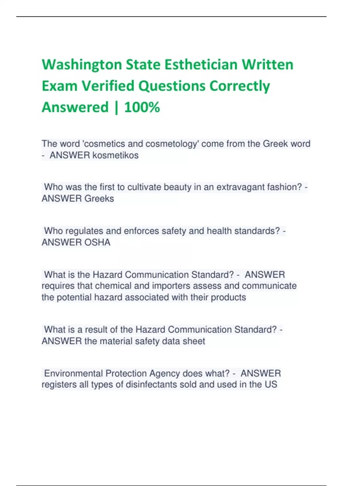 Washington State Esthetician Written Exam Verified Questions Correctly Answered | 100% The word 'cosmetics and cosmetology' come from the Greek word - ANSWER kosmetikos Who was the first to cultivate beauty in an extravagant fashion? - ANSWER Greeks Who regulates and enforces safety and health standards? - ANSWER OSHA What is the Hazard Communication Standard? - ANSWER requires that chemical and importers assess and communicate the potential hazard associated with their products What is a result of the Hazard Communication Standard? - ANSWER the material safety data sheet Environmental Protection Agency does what? - ANSWER registers all types of disinfectants sold and used in the US Hospital disinfectants - ANSWER Effective for cleaning blood and body fluids Tuberculocidal disinfectants - ANSWER Disinfectants that kill the bacteria that causes tuberculosis. True or false: It is against federal law to use any disinfecting product contrary to its labeling - ANSWER True Why does the State Regulatory Agencies exist? - ANSWER protect salon and spa professionals and to protect consumers' health, safety, and welfare while they receive salon and spa services Infection control - ANSWER The methods used to eliminate or reduce the transmission of infectious organisms Is disinfection effective against bacterial spores? - ANSWER no Disinfectants used in salons and spas must be what? - ANSWER Bactericidal, virucidal, and fungicidal Bacteria - ANSWER one-celled microscopic organisms that have both plant and animal characteristics Microorganism - ANSWER Any organism of microscopic or submicroscopic size Most bacteria is what? - ANSWER nonpathogenic Cocci - ANSWER Round shaped bacteria that appear singly or in groups Staphylococci - ANSWER pus-forming bacteria that grow in clusters Staphylococci cause what? - ANSWER abscesses, pustules, and boils Streptococci - ANSWER Pus-forming bacteria arranged in curved lines