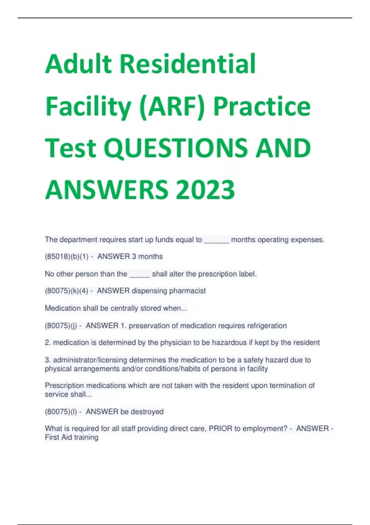 Adult Residential Facility (ARF) Practice Test QUESTIONS AND ANSWERS 2023 The department requires start up funds equal to ______ months operating expenses. (85018)(b)(1) - ANSWER 3 months No other person than the _____ shall alter the prescription label. (80075)(k)(4) - ANSWER dispensing pharmacist Medication shall be centrally stored when... (80075)(j) - ANSWER 1. preservation of medication requires refrigeration 2. medication is determined by the physician to be hazardous if kept by the resident 3. administrator/licensing determines the medication to be a safety hazard due to physical arrangements and/or conditions/habits of persons in facility Prescription medications which are not taken with the resident upon termination of service shall... (80075)(l) - ANSWER be destroyed What is required for all staff providing direct care, PRIOR to employment? - ANSWER - First Aid training -TB test -background clearance How long are client records retained? (80066)(d) - ANSWER 3 years Modifications to the admissions agreement requires how much notice? (80068)(4) - ANSWER 30 *CALENDAR* days Fingerprints shall be submitted to the Department of Justice (DOJ) within what time frame of employment? (80019)(2)(e) - ANSWER prior to employment When is an employee fingerprinted? (80065) - ANSWER prior to employment The death of a client requires a written report submitted to CCLD within how many days? (80061)(b) - ANSWER 7 WORKING days What is required for taps/faucets delivering water temperatures 125°F or above? (80088)(3)(b) - ANSWER a warning/cautious sign What is the mandated water temperature range for taps/faucets? - ANSWER 105°F -- 120°F According to CCLD, what are employees providing night supervision from 10pm to 7am and who assist with care and supervision required to have for emergencies? (85065.6)(b) - ANSWER -the facility's planned emergency procedures -a first aide certificate Any changes in the licensee's or applicants mailing address shall be submitted to CCLD within... (80061)(c) - ANSWER 10 WORKING days What are the time frames that a TB test must be performed on facility staff? (80065)(g)(1) - ANSWER no more than 1 year PRIOR TO or WITHIN 7 days after employment Except for children's residential facilities, the licensee may, upon 30 days written notice to the client may only evict them for non-payment of the rate for basic services w/in how many days of the due date? (80068.5)(a)(1) - ANSWER 10 days If a licensee dies, an adult relative who has control of the property shall be allowed to continue the operation of the facility under what approval? (80035)(b)(1) - ANSWER emergency approval to operate (for 60 days) (a provisional license is granted for 12 months) Example of proof of control of the facility property includes a: (80001)(17(a-c) - ANSWER deed, estate settlement, *or* lease Casts and braces are examples of what? (80072)(8)(a) - ANSWER postural supports Licensing has the authority to inspect what part of the facility? (80044) - ANSWER the entire facility In lieu of locked storage of firearms, what can a licensee do? (80087)(2)(a) - ANSWER use trigger locks or remove the firing pin What size facility shall post their license in a prominent location? (85009) - ANSWER 7 or larger A supply of staple *nonperishable* food shall be maintained in the facility for a minimum of... (85076)(d)(1) - ANSWER One week/7 days This temperature in a clients room shall be heated to at