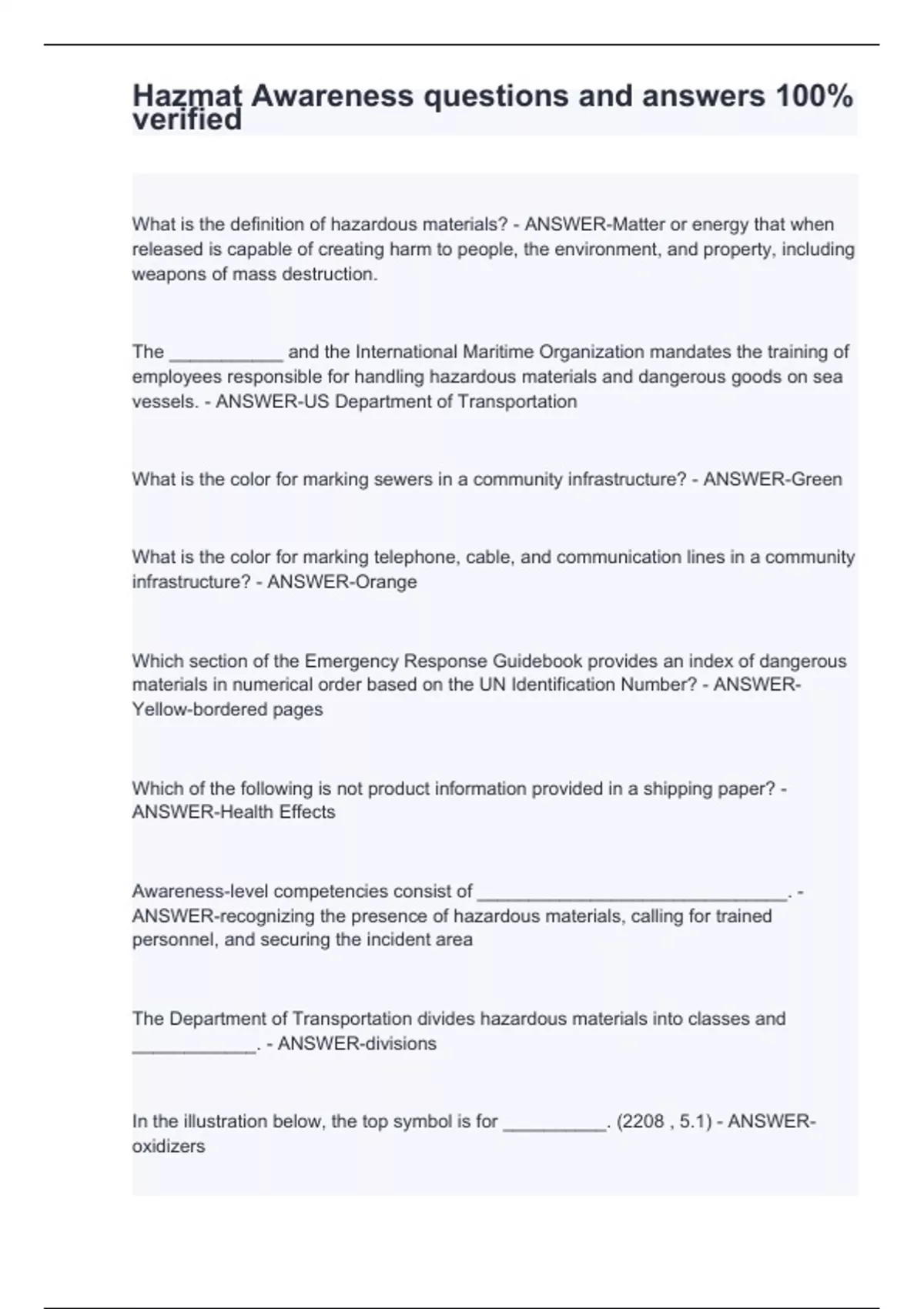 What is the definition of hazardous materials? - ANSWER-Matter or energy that when released is capable of creating harm to people, the environment, and property, including weapons of mass destruction. The ___________ and the International Maritime Organization mandates the training of employees responsible for handling hazardous materials and dangerous goods on sea vessels. - ANSWER-US Department of Transportation What is the color for marking sewers in a community infrastructure? - ANSWER-Green What is the color for marking telephone, cable, and communication lines in a community infrastructure? - ANSWER-Orange Which section of the Emergency Response Guidebook provides an index of dangerous materials in numerical order based on the UN Identification Number? - ANSWER-Yellow-bordered pages Which of the following is not product information provided in a shipping paper? - ANSWER-Health Effects Awareness-level competencies consist of ______________________________. - ANSWER-recognizing the presence of hazardous materials, calling for trained personnel, and securing the incident area The Department of Transportation divides hazardous materials into classes and ____________. - ANSWER-divisions In the illustration below, the top symbol is for __________. (2208 , 5.1) - ANSWER-oxidizers Which section of the safety data sheet (SDS) provides signs and symptoms of exposure to a chemical? - ANSWER-Section 4, First Aid Measures