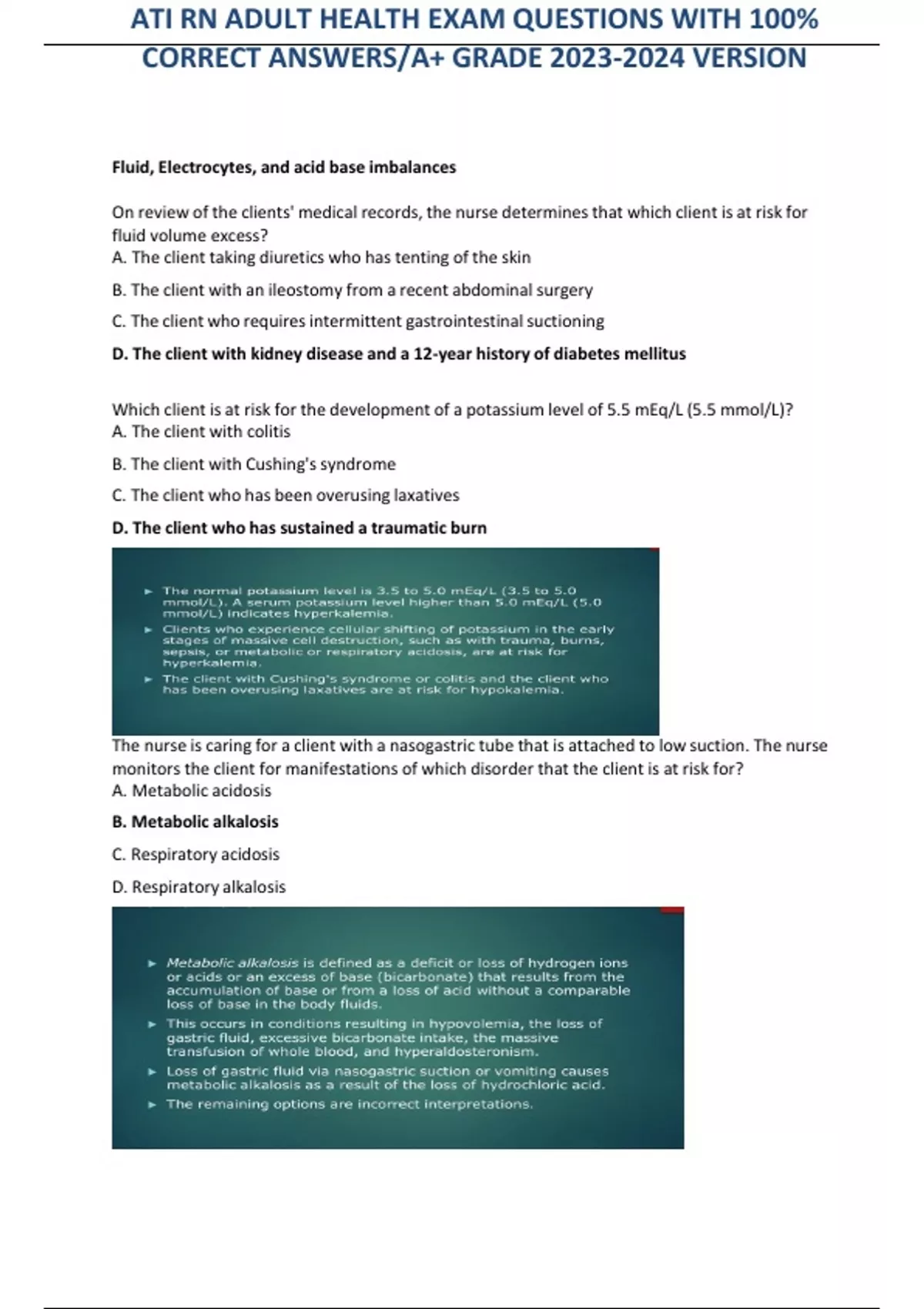 ATI RN ADULT HEALTH EXAM QUESTIONS WITH 100% CORRECT ANSWERS/A+ GRADE VERSION Fluid, Electrocytes, and acid base imbalances On review of the clients' medical records, the nurse determines that which client is at risk for fluid volume excess? A. The client taking diuretics who has tenting of the skin B. The client with an ileostomy from a recent abdominal surgery C. The client who requiresintermittent gastrointestinalsuctioning D. The client with kidney disease and a 12-year history of diabetes mellitus Which client is at risk for the development of a potassium level of 5.5 mEq/L (5.5 mmol/L)? A. The client with colitis B. The client with Cushing's syndrome C. The client who has been overusing laxatives D. The client who has sustained a traumatic burn The nurse is caring for a client with a nasogastric tube that is attached to low suction. The nurse monitors the client for manifestations of which disorder that the client is at risk for? A. Metabolic acidosis B. Metabolic alkalosis C. Respiratory acidosis D. Respiratory alkalosis ATI RN ADULT HEALTH EXAM QUESTIONS WITH 100% CORRECT ANSWERS/A+ GRADE VERSION A client with a 3-day history of nausea and vomiting presents to the emergency department. The client is hypoventilating and has a respiratory rate of 10 breaths per minute. The electrocardiogram (ECG) monitor displays tachycardia, with a heart rate of 120 beats per minute. Arterial blood gases are drawn and the nurse reviews the results, expecting to note which finding? A. A decreased pH and an increased Paco₂ B. An increased pH and a decreased Paco₂ C. A decreased pH and a decreased HCO₃- D. An increased pH and an increased HCO₃- The nurse notesthat a client's arterial blood gas (ABG) results reveal a pH of 7.50 and a Paco2 of 30 mm Hg (30 mm Hg). The nurse monitors the client for which clinical manifestations associated with these ABG results? Select all that apply. A. Nausea B. Confusion C. Bradypnea D. Tachycardia E. Hyperkalemia F. Lightheadedness ATI RN ADULT HEALTH EXAM QUESTIONS WITH 100% CORRECT ANSWERS/A+ GRADE VERSION 6. The nurse is caring for a client who is on a mechanical ventilator. Blood gas results indicate a pH of 7.50 and a Paco2 of 30 mm Hg (30 mm Hg). The nurse has determined that the client is experiencing respiratory alkalosis. Which laboratory value would most likely be noted in this condition? A. Sodium level of 145 mEq/L (145 mmol/L) B. Potassium level of 3.0 mEq/L (3.0 mmol/L) C. Magnesium level of 1.8 (0.74 mmol/L) D. Phosphorus level of 3.0 mg/L (0.97 mmol/L) The nurse is caring for a client with several broken ribs. The client is most likely to experience what type of acid-base imbalance? A. Respiratory acidosisfrom inadequate ventilation B. Respiratory alkalosisfrom anxiety and hyperventilation C. Metabolic acidosisfrom calcium loss due to broken bones D. Metabol