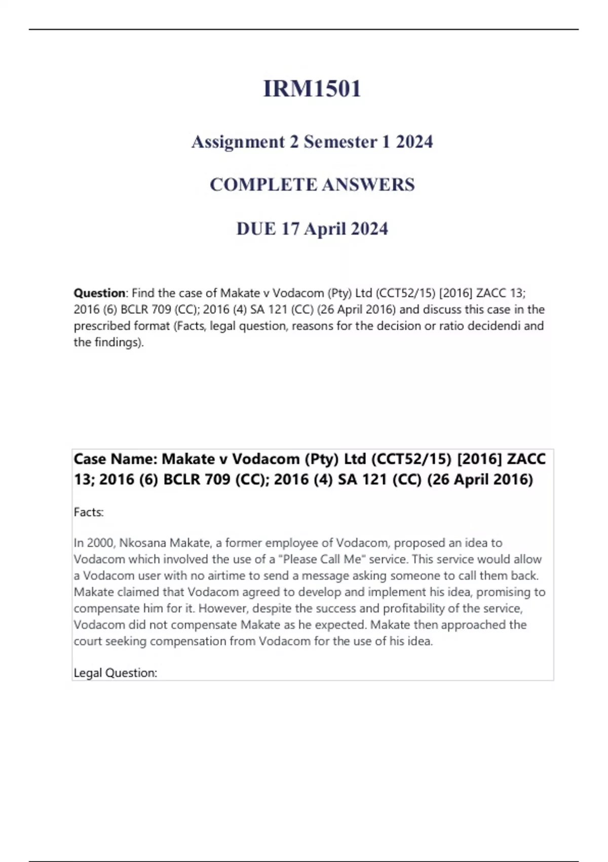 Question: Find the case of Makate v Vodacom (Pty) Ltd (CCT52/15) [2016] ZACC 13;