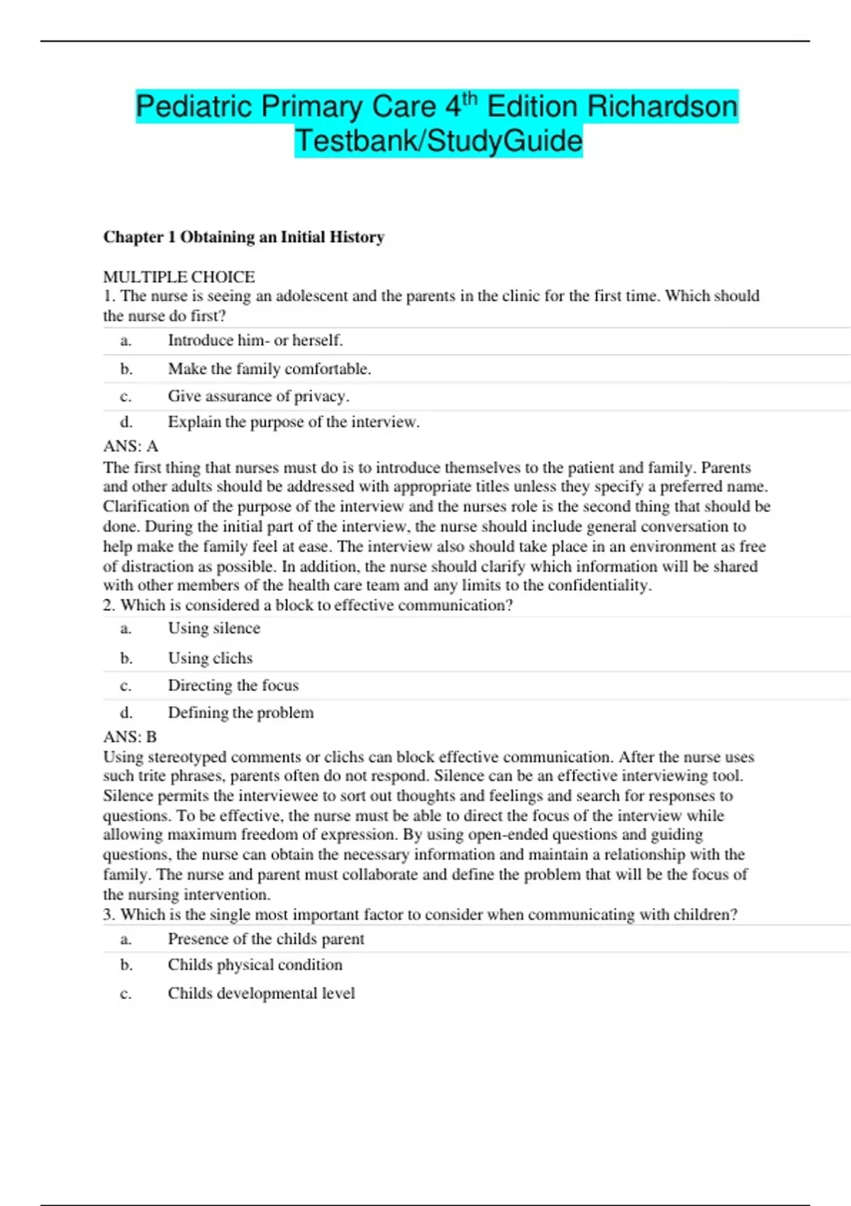 Pediatric Primary Care 4th Edition Richardson Testbank/StudyGuide Chapter 1 Obtaining an Initial History MULTIPLE CHOICE 1. The nurse is seeing an adolescent and the parents in the clinic for the first time. Which should the nurse do first? a. Introduce him- or herself. b. Make the family comfortable. c. Give assurance of privacy. d. Explain the purpose of the interview. ANS: A The first thing that nurses must do is to introduce themselves to the patient and family. Parents and other adults should be addressed with appropriate titles unless they specify a preferred name. Clarification of the purpose of the interview and the nurses role is the second thing that should be done. During the initial part of the interview, the nurse should include general conversation to help make the family feel at ease. The interview also should take place in an environment as free of distraction as possible. In addition, the nurse should clarify which information will be shared with other members of the health care team and any limits to the confidentiality. 2. Which is considered a block to effective communication? a. Using silence b. Using clichs c. Directing the focus d. Defining the problem ANS: B Using stereotyped comments or clichs can block effective communication. After the nurse uses such trite phrases, parents often do not respond. Silence can be an effective interviewing tool. Silence permits the interviewee to sort out thoughts and feelings and search for responses to questions. To be effective, the nurse must be able to direct the focus of the interview while allowing maximum freedom of expression. By using open-ended questions and guiding questions, the nurse can obtain the necessary information and maintain a relationship with the family. The nurse and parent must collaborate and define the problem that will be the focus of the nursing intervention. 3. Which is the single most important factor to consider when communicating with children? a. Presence of the childs parent b. Childs physical condition c. Childs developmental level d. Childs nonverbal behaviors ANS: C The nurse must be aware of the childs developmental stage to engage in effective communication. The use of both verbal and nonverbal communication should be appropriate to the developmental level. Nonverbal behaviors vary in importance based on the childs developmental level and physical condition. Although the childs physical condition is a consideration, developmental level is much more important. The presence of parents is important when communicating with young children but may be detrimental when speaking with adolescents. 4. Because children younger than 5 years are egocentric, the nurse should do which when communicating with them? a. Focus communication on the child. b. Use easy analogies when possible. c. Explain experiences of others to the child. d. Assure the child that communication is private. ANS: A Because children of this age are able to see things only in terms of themselves, the best approach is to focus communication directly on them. Children should be provided with information about what they can do and how they will feel. With children who are egocentric, analogies, experiences, and assurances that communication is private will not be effective because the child is not capable of understanding. 5. The nurses approach when introducing hospital equipment to a preschooler who seems afraid should be based on which principle? a. The child may think the equipment is alive. b. Explaining the equipment will only increase the childs fear. c. One brief explanation will be enough to reduce the childs fear. d. The child is too young to understand what the equipment does. ANS: A Young children attribute human characteristics to inanimate objects. They often fear that the objects may jump, bite, cut, or pinch all by themselves without human direction. Equipment should be kept out of sight until needed. Simple, concrete explanations about what the equipment does and how it will feel will help alleviate the childs fear. Preschoolers need repeated explanations as reassurance. 6. When the nurse interviews an adolescent, which is especially important? a. Focus the discussion on the peer group. b. Allow an opportunity to express feelings. c. Use the same type of language as the adolescent. d. Emphasize that confidentiality will always be maintained. ANS: B Adolescents, like all children, need opportunities to express their feelings. Often they interject feelings into their words. The nurse must be alert to the words and feelings expressed. The nurse should maintain a professional relationship with adolescents. To avoid misunderstanding or misinterpretation of words and phrases used, the nurse should clarify the terms used, what information will be shared with other members of the health care team, and any limits to confidentiality. Although the peer group is important to this age group, the interview should focus on the adolescent. 7. The nurse is preparing to assess a 10-month-old infant. He is sitting on his fathers lap and appears to be afraid of the nurse and of what might happen next. Which initial actions by the nurse should be most appropriate? a. Initiate a game of peek-a-boo. b. Ask the infants father to place the infant on the examination table. c. Talk softly to the infant while taking him from his father. d. Undress the infant while he is still sitting on his fathers lap. ANS: A Peek-a-boo is an excellent means of initiating communication with infants while maintaining a safe, nonthreatening distance. The child will most likely become upset if separated from his father. As much of the assessment as possible should be done with the child on the fathers lap. The nurse should have the father undress the child as needed during the examination. 8. An 8-year-old girl asks the nurse how the blood pressure apparatus works. The most appropriate nursing action is which? a. Ask her why she wants to know. b. Determine why she is