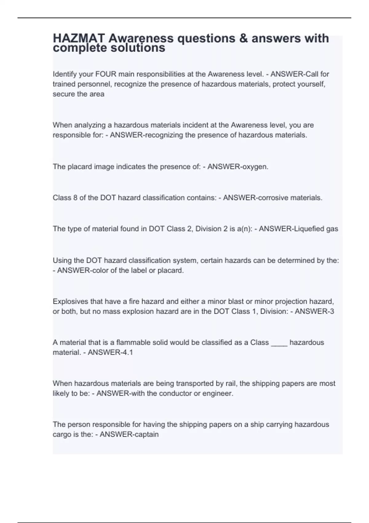 Identify your FOUR main responsibilities at the Awareness level. - ANSWER-Call for trained personnel, recognize the presence of hazardous materials, protect yourself, secure the area When analyzing a hazardous materials incident at the Awareness level, you are responsible for: - ANSWER-recognizing the presence of hazardous materials. The placard image indicates the presence of: - ANSWER-oxygen. Class 8 of the DOT hazard classification contains: - ANSWER-corrosive materials. The type of material found in DOT Class 2, Division 2 is a(n): - ANSWER-Liquefied gas Using the DOT hazard classification system, certain hazards can be determined by the: - ANSWER-color of the label or placard. Explosives that have a fire hazard and either a minor blast or minor projection hazard, or both, but no mass explosion hazard are in the DOT Class 1, Division: - ANSWER-3 A material that is a flammable solid would be classified as a Class ____ hazardous material. - ANSWER-4.1 When hazardous materials are being transported by rail, the shipping papers are most likely to be: - ANSWER-with the conductor or engineer. The person responsible for having the shipping papers on a ship carrying hazardous cargo is the: - ANSWER-captain