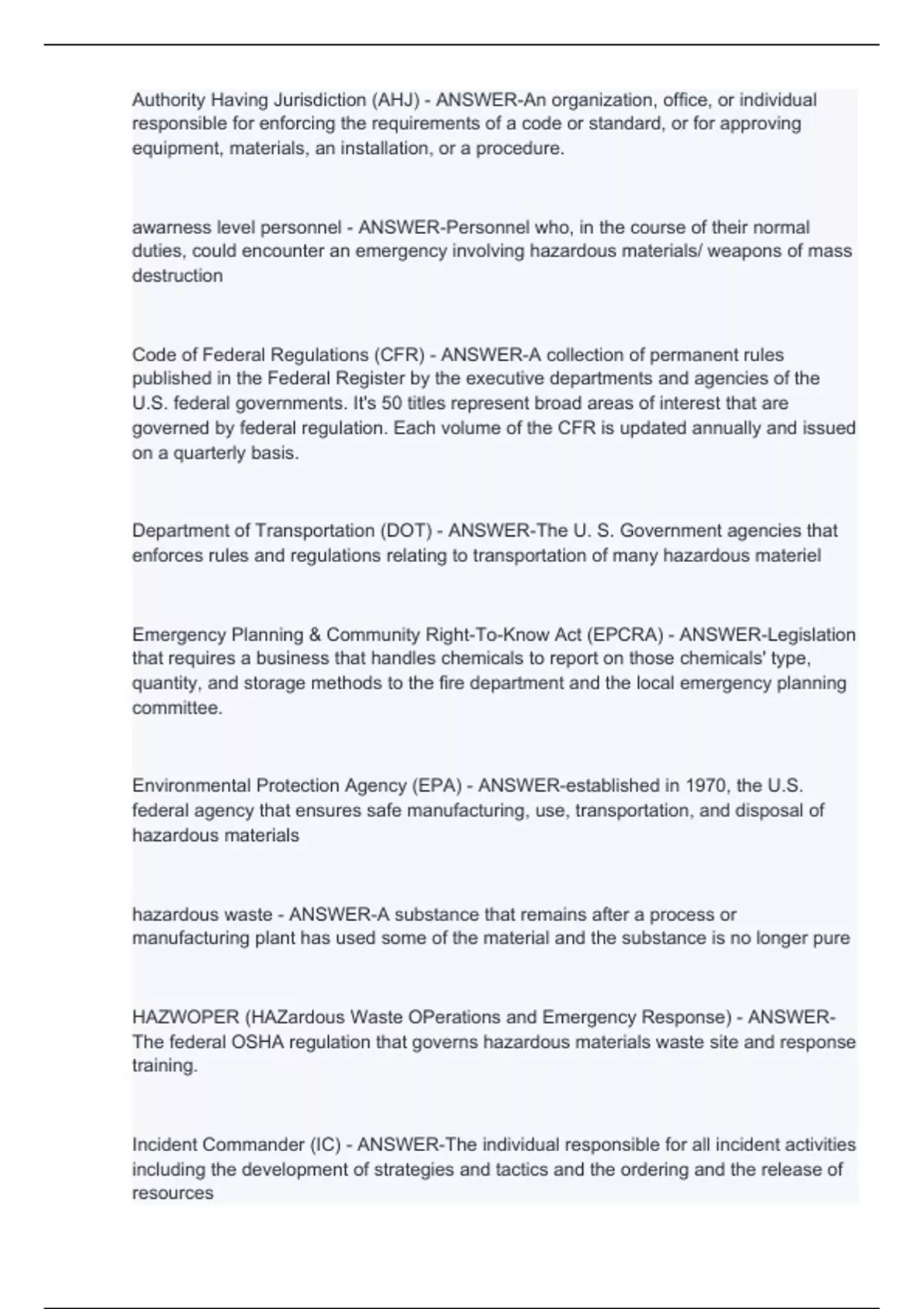 Authority Having Jurisdiction (AHJ) - ANSWER-An organization, office, or individual responsible for enforcing the requirements of a code or standard, or for approving equipment, materials, an installation, or a procedure. awarness level personnel - ANSWER-Personnel who, in the course of their normal duties, could encounter an emergency involving hazardous materials/ weapons of mass destruction Code of Federal Regulations (CFR) - ANSWER-A collection of permanent rules published in the Federal Register by the executive departments and agencies of the U.S. federal governments. It's 50 titles represent broad areas of interest that are governed by federal regulation. Each volume of the CFR is updated annually and issued on a quarterly basis. Department of Transportation (DOT) - ANSWER-The U. S. Government agencies that enforces rules and regulations relating to transportation of many hazardous materiel Emergency Planning & Community Right-To-Know Act (EPCRA) - ANSWER-Legislation that requires a business that handles chemicals to report on those chemicals' type, quantity, and storage methods to the fire department and the local emergency planning committee. Environmental Protection Agency (EPA) - ANSWER-established in 1970, the U.S. federal agency that ensures safe manufacturing, use, transportation, and disposal of hazardous materials hazardous waste - ANSWER-A substance that remains after a process or manufacturing plant has used some of the material and the substance is no longer pure