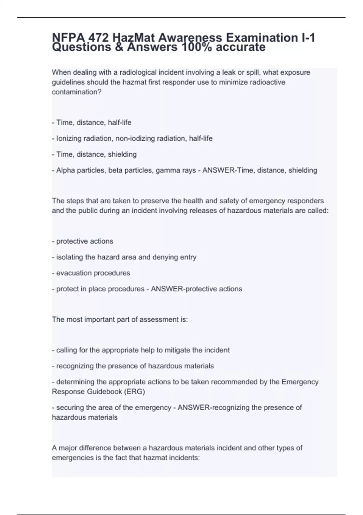 When dealing with a radiological incident involving a leak or spill, what exposure guidelines should the hazmat first responder use to minimize radioactive contamination? - Time, distance, half-life - Ionizing radiation, non-iodizing radiation, half-life - Time, distance, shielding - Alpha particles, beta particles, gamma rays - ANSWER-Time, distance, shielding The steps that are taken to preserve the health and safety of emergency responders and the public during an incident involving releases of hazardous materials are called: - protective actions - isolating the hazard area and denying entry - evacuation procedures - protect in place procedures - ANSWER-protective actions The most important part of assessment is: - calling for the appropriate help to mitigate the incident - recognizing the presence of hazardous materials - determining the appropriate actions to be taken recommended by the Emergency Response Guidebook (ERG) - securing the area of the emergency - ANSWER-recognizing the presence of hazardous mate