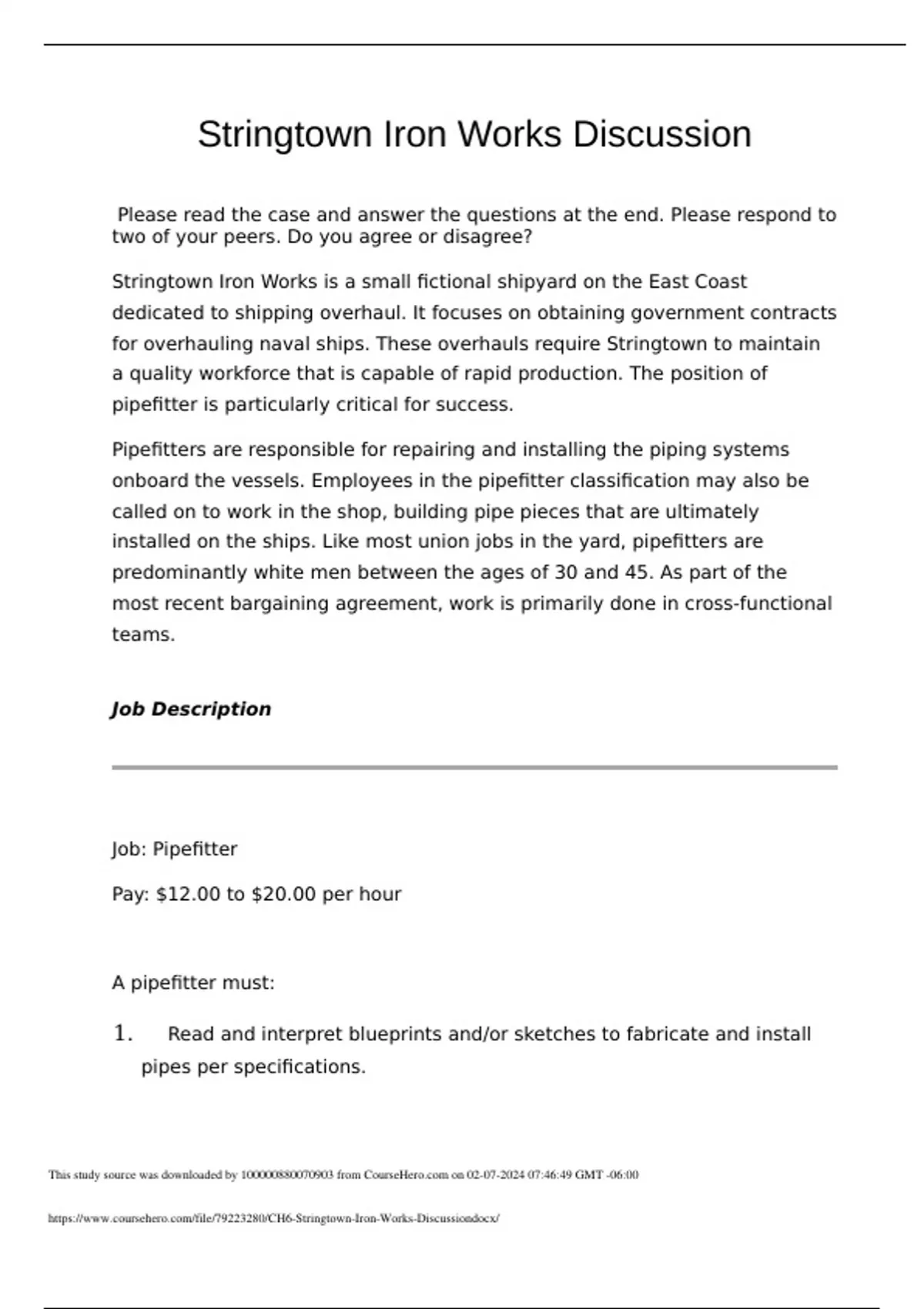 Stringtown Iron Works Discussion Please read the case and answer the questions at the end. Please respond to two of your peers. Do you agree or disagree? Stringtown Iron Works is a small fictional shipyard on the East Coast dedicated to shipping overhaul. It focuses on obtaining government contracts for overhauling naval ships. These overhauls require Stringtown to maintain a quality workforce that is capable of rapid production. The position of pipefitter is particularly critical for success. Pipefitters are responsible for repairing and installing the piping systems onboard the vessels. Employees in the pipefitter classification may also be called on to work in the shop, building pipe pieces that are ultimately installed on the ships. Like most union jobs in the yard, pipefitters are predominantly white men between the ages of 30 and 45. As part of the most recent bargaining agreement, work is primarily done in cross-functional teams