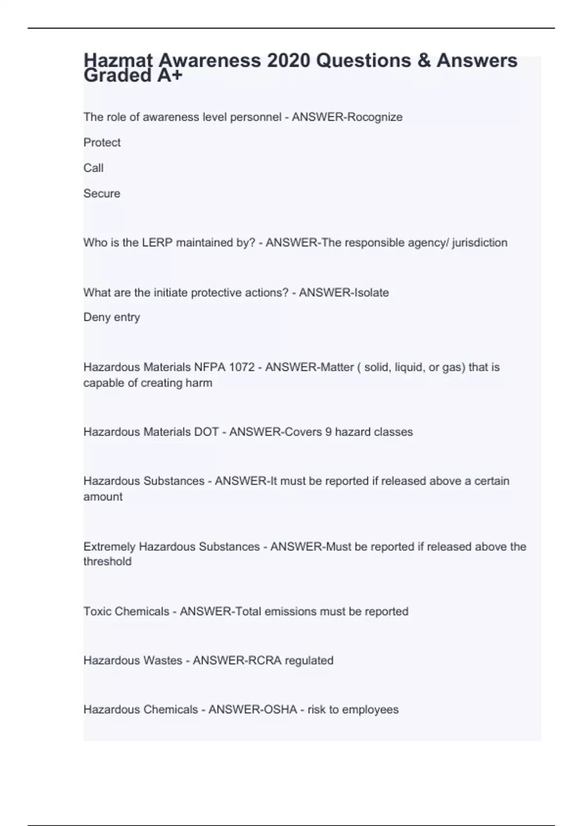 The role of awareness level personnel - ANSWER-Rocognize Protect Call Secure Who is the LERP maintained by? - ANSWER-The responsible agency/ jurisdiction What are the initiate protective actions? - ANSWER-Isolate Deny entry Hazardous Materials NFPA 1072 - ANSWER-Matter ( solid, liquid, or gas) that is capable of creating harm Hazardous Materials DOT - ANSWER-Covers 9 hazard classes Hazardous Substances - ANSWER-It must be reported if released above a certain amount Extremely Hazardous Substances - ANSWER-Must be reported if released above the threshold Toxic Chemicals - ANSWER-Total emissions must be reported Hazardous Wastes - ANSWER-RCRA regulated Hazardous Chemicals - ANSWER-OSHA - risk to employees