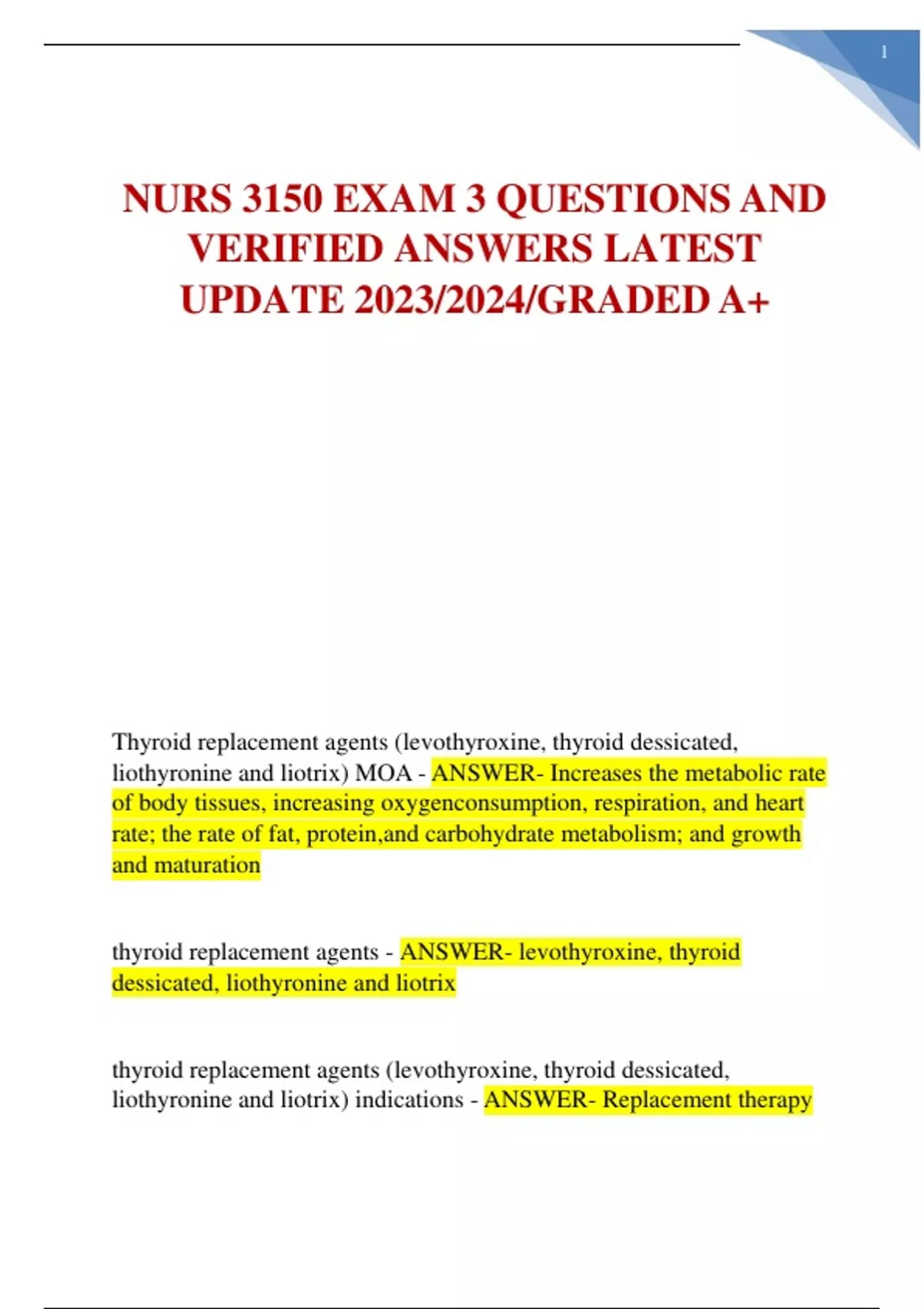 nurs 3150 exam 3 questions and verified answers la