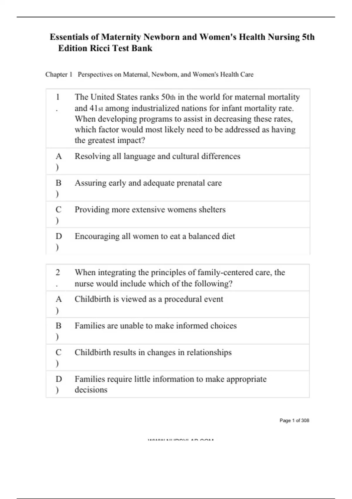 Chapter 1 Perspectives on Maternal, Newborn, and Women's Health Care 1 . The United States ranks 50th in the world for maternal mortality and 41st among industrialized nations for infant mortality rate. When developing programs to assist in decreasing these rates, which factor would most likely need to be addressed as having the greatest impact? A ) Resolving all language and cultural differences B ) Assuring early and adequate prenatal care C ) Providing more extensive womens shelters D ) Encouraging all women to eat a balanced diet 2 . When integrating the principles of family-centered care, the nurse would include which of the following? A ) Childbirth is viewed as a procedural event B ) Families are unable to make informed choices C ) Childbirth results in changes in relationships D ) Families require little information to make appropriate decisions