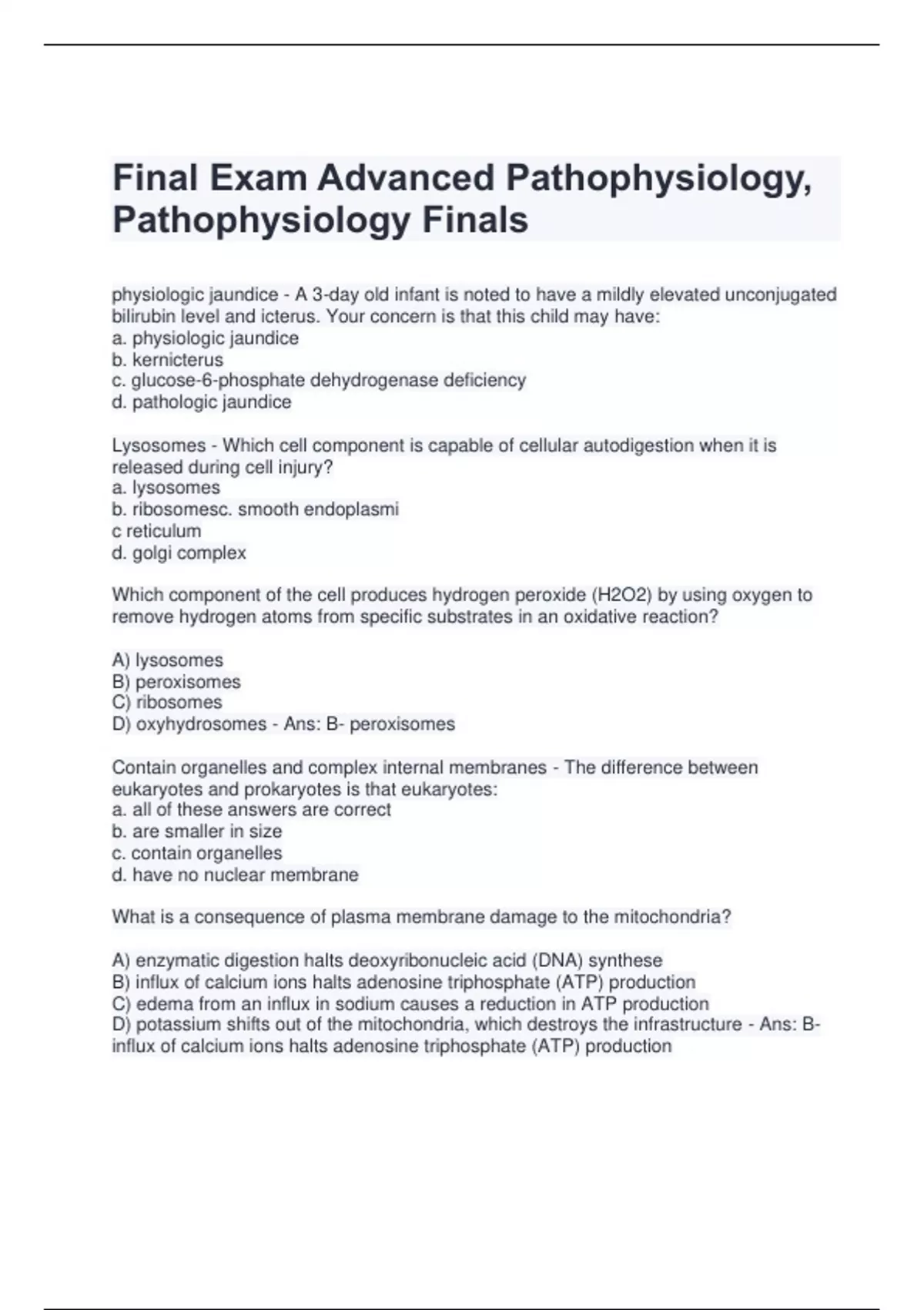 physiologic jaundice - A 3-day old infant is noted to have a mildly elevated unconjugated bilirubin level and icterus. Your concern is that this child may have: a. physiologic jaundice b. kernicterus c. glucose-6-phosphate dehydrogenase deficiency d. pathologic jaundice Lysosomes - Which cell component is capable of cellular autodigestion when it is released during cell injury? a. lysosomes b. ribosomesc. smooth endoplasmi c reticulum d. golgi complex Which component of the cell produces hydrogen peroxide (H2O2) by using oxygen to remove hydrogen atoms from specific substrates in an oxidative reaction? A) lysosomes B) peroxisomes C) ribosomes D) oxyhydrosomes - Ans: B- peroxisomes Contain organelles and complex internal membranes - The difference between eukaryotes and prokaryotes is that eukaryotes: a. all of these answers are correct b. are smaller in size c. contain organelles d. have no nuclear membrane What is a consequence of plasma membrane damage to the mitochondria? A) enzymatic digestion halts deoxyribonucleic acid (DNA) synthese B) influx of calcium ions halts adenosine triphosphate (ATP) production C) edema from an influx in sodium causes a reduction in ATP production D) potassium shifts out of the mitochondria, which destroys the infrastructure - Ans: B- influx of calcium ions halts adenosine triphosphate (ATP) production Packages protein for secretion to the outside of the cell - Which of the following is function of Golgi? a. Packages protein for secretion to the outside of the cell b. Produces ATP for cell function c. Contains hydrolytic enzymes d. Is the site of protein synthesis in a cell Which statement is a description of one of the characteristics of apoptosis? A) apoptosis involves programmed cell death of scattered singel cells B) apoptosis is characterized by the swelling of the nucleus and the cytoplasm C) apoptosis involves unpredictable patterns of cell death D) apoptosis results in benign malignancies - Ans: A- apoptosis involves programmed cell death of scattered singel cells During cell injury caused by hypoxia, sodium and water move into the cell because: A) during cell injury cause by hypoxia, sodium and water move into the cell because: B) the pump that transports sodium out of the cell cannot function because of a decrease in adenosine triphosphate (ATP) levels C) the osmotic pressure is increased, which pulls additional sodium across the cell membrane D) oxygen is not available to bind with sodium to maintain it outside of the cell - Ans: C- the osmotic pressure is increased, which pulls additional sodium across the cell membrane