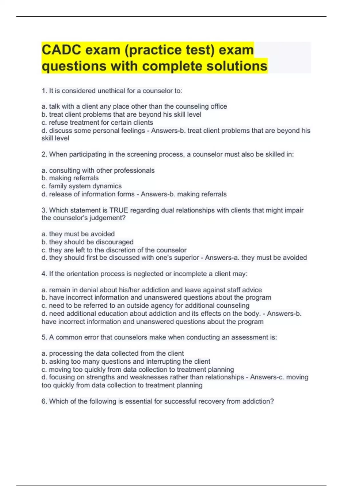 1. It is considered unethical for a counselor to: a. talk with a client any place other than the counseling office b. treat client problems that are beyond his skill level c. refuse treatment for certain clients d. discuss some personal feelings - Answers-b. treat client problems that are beyond his skill level 2. When participating in the screening process, a counselor must also be skilled in: a. consulting with other professionals b. making referrals c. family system dynamics d. release of information forms - Answers-b. making referrals 3. Which statement is TRUE regarding dual relationships with clients that might impair the counselor's judgement? a. they must be avoided b. they should be discouraged c. they are left to the discretion of the counselor d. they should first be discussed with one's superior - Answers-a. they must be avoided 4. If the orientation process is neglected or incomplete a client may: a. remain in denial about his/her addiction and leave against staff advice b. have incorrect information and unanswered questions about the program c. need to be referred to an outside agency for additional counseling d. need additional education about addiction and its effects on the body. - Answers-b. have incorrect information and unanswered questions about the program 5. A common error that counselors make when conducting an assessment is: a. processing the data collected from the client b. asking too many questions and interrupting the client c. moving too quickly from data collection to treatment planning d. focusing on strengths and weaknesses rather than relationships - Answers-c. moving too quickly from data collection to treatment planning 6. Which of the following is essential for successful recovery from addiction?