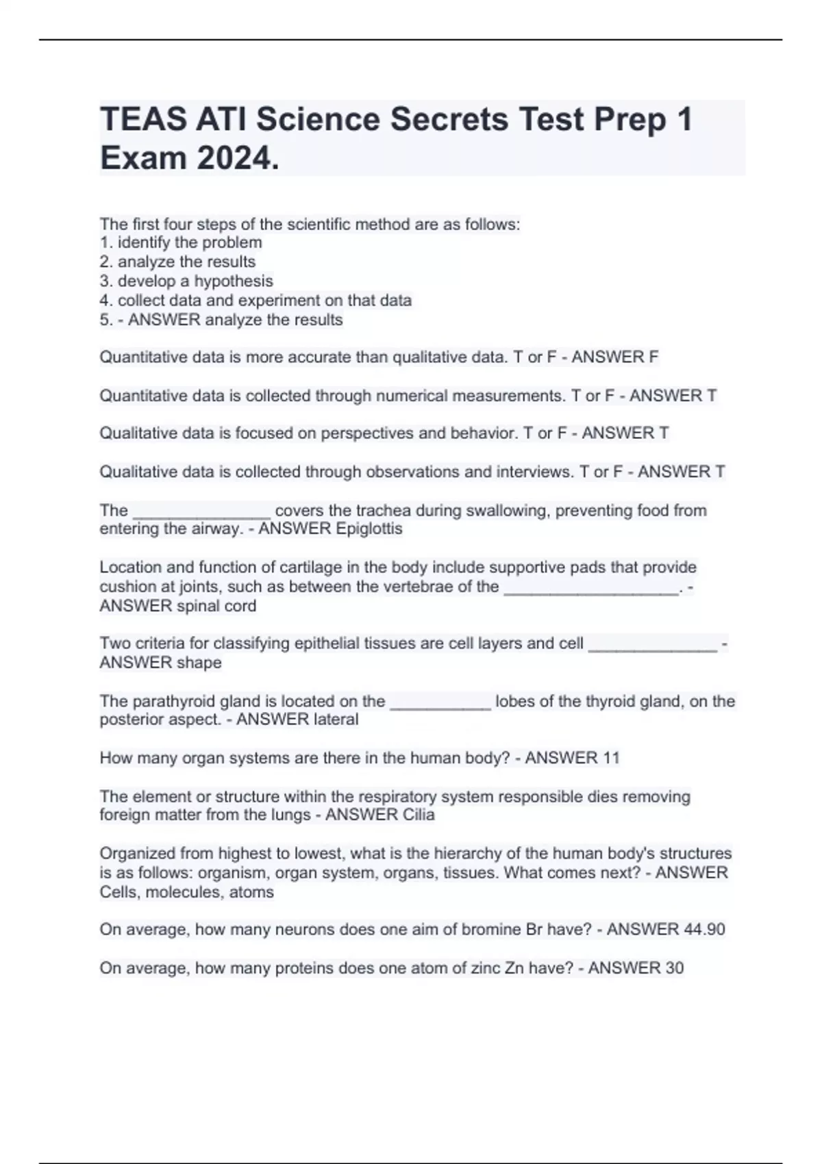 TEAS ATI Science Secrets Test Prep 1 Exam 2024. The first four steps of the scientific method are as follows: 1. identify the problem 2. analyze the results 3. develop a hypothesis 4. collect data and experiment on that data 5. - ANSWER analyze the results Quantitative data is more accurate than qualitative data. T or F - ANSWER F Quantitative data is collected through numerical measurements. T or F - ANSWER T Qualitative data is focused on perspectives and behavior. T or F - ANSWER T Qualitative data is collected through observations and interviews. T or F - ANSWER T The _______________ covers the trachea during swallowing, preventing food from entering the airway. - ANSWER Epiglottis Location and function of cartilage in the body include supportive pads that provide cushion at joints, such as between the vertebrae of the ___________________. - ANSWER spinal cord Two criteria for classifying epithelial tissues are cell layers and cell ______________ - ANSWER shape The parathyroid gland is located on the ___________ lobes of the thyroid gland, on the posterior aspect. - ANSWER lateral How many organ systems are there in the human body? - ANSWER 11 The element or structure within the respiratory system responsible dies removing foreign matter from the lungs - ANSWER Cilia Organized from highest to lowest, what is the hierarchy of the human body's structures is as follows: organism, organ system, organs, tissues. What comes next? - ANSWER Cells, molecules, atoms On average, how many neurons does one aim of bromine Br have? - ANSWER 44.90 On average, how many proteins does one atom of zinc Zn have? - ANSWER 30