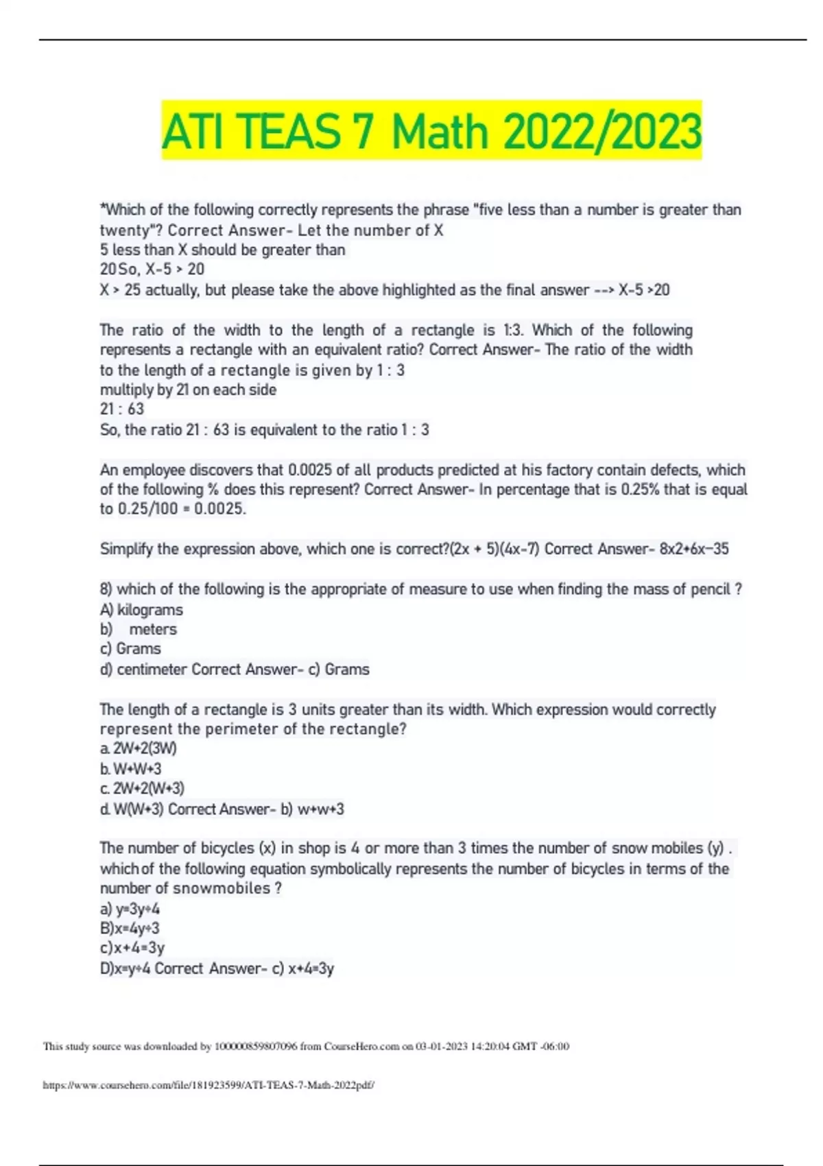 ATI TEAS 7 Math 2022/2023 *Which of the following correctly represents the phrase "five less than a number is greater than twenty"? Correct Answer- Let the number of X 5 less than X should be greater than 20So, X-5 20 X 25 actually, but please take the above highlighted as the final answer -- X-5 20 The ratio of the width to the length of a rectangle is 1:3. Which of the following represents a rectangle with an equivalent ratio? Correct Answer- The ratio of the width to the length of a rectangle is given by 1 : 3 multiply by 21 on each side 21 : 63 So, the ratio 21 : 63 is equivalent to the ratio 1 : 3 An employee discovers that 0.0025 of all products predicted at his factory contain defects, which of the following % does this represent? Correct Answer- In percentage that is 0.25% that is equal to 0.25/100 = 0.0025. Simplify the expression above, which one is correct?(2x + 5)(4x-7) Correct Answer- 8x2+6x−35 8) which of the following is the appropriate of measure to use when finding the mass of pencil ? A) kilograms b) meters c) Grams d) centimeter Correct Answer- c) Grams The length of a rectangle is 3 units greater than its width. Which expression would correctly represent the perimeter of the rectangle? a.2W+2(3W) b.W+W+3 c. 2W+2(W+3) d. W(W+3) CorrectAnswer- b) w+w+3 The number of bicycles (x) in shop is 4 or more than 3 times the number of snow mobiles (y) . whichof the following equation symbolically represents the number of bicycles in terms of the number of snowmobiles ? a) y=3y÷4 B)x=4y÷3 c)x+4=3y D)x=y÷4 Correct Answer- c) x+4=3y This study source was downloaded by from CourseH on :20:04 GMT -06:00 Which of the following is correct comparison of two rational numbers? Correct Answer- 0.64/7 A vertical meter stick casts a shadow of 0.4 meters. If a tree casts a shadow of 12 meters at the same time, how tall is the tree? Correct Answer- x=30 meters Which of the following point of fraction with a common denominator are equivalent to 1/4 and 2/5? Correct Answer- 5/20, 8/20 The table shows a survey of auto mobile color preference. Which of the following statements about the survey responses is correct? Correct Answer- From the frequency table we can see that frequency for red is 6 and frequency of white is 6 . That is frequency of red or white is 6+6 = 12 That means 12 survey respondent preferred White or Red . This is the correct statement If the pediatric unit of a hospital has 165 beds, how many rooms are there if each room holds 3 beds? Correct Answer- 165/3=55 A student starts working for $12 per hour. After a year he gets a raise and earns $13.50 per hour.Which of the following represents the increase in the students wage? Correct AnswerStarting salary is $ 12 per hour After raise his present salary is $ 13.5 per hour. So increase in wage is (13.5 - 12) = $ 1.5 per hour.Percentage increase in wage is: = $12.50 1.5x100/12=12.5 A student rounds a number to 12.9. Which of the following possible value is the original number? Correct Answer- The most possible value of the original number is 12.939, because on rounding off to the nearest tenths place , 12.939 gives 12.9 Which of the following percentages is equivalent to 31/50 (round to two decimal places). a. 1.61% b. 16.13% c. 62.00% d. 0.62% Correct Answer- d) 0.62% A patient drives 19 miles one way to medical facility for treatment. Howfar does the patient drive round trip in 22 days of treatment? Correct Answer- Total distance per day =2x19=38 miles Total 22 days of treatment =38x22= 836miles Simplify the expression above which of the following is correct? Correct Answer- 4