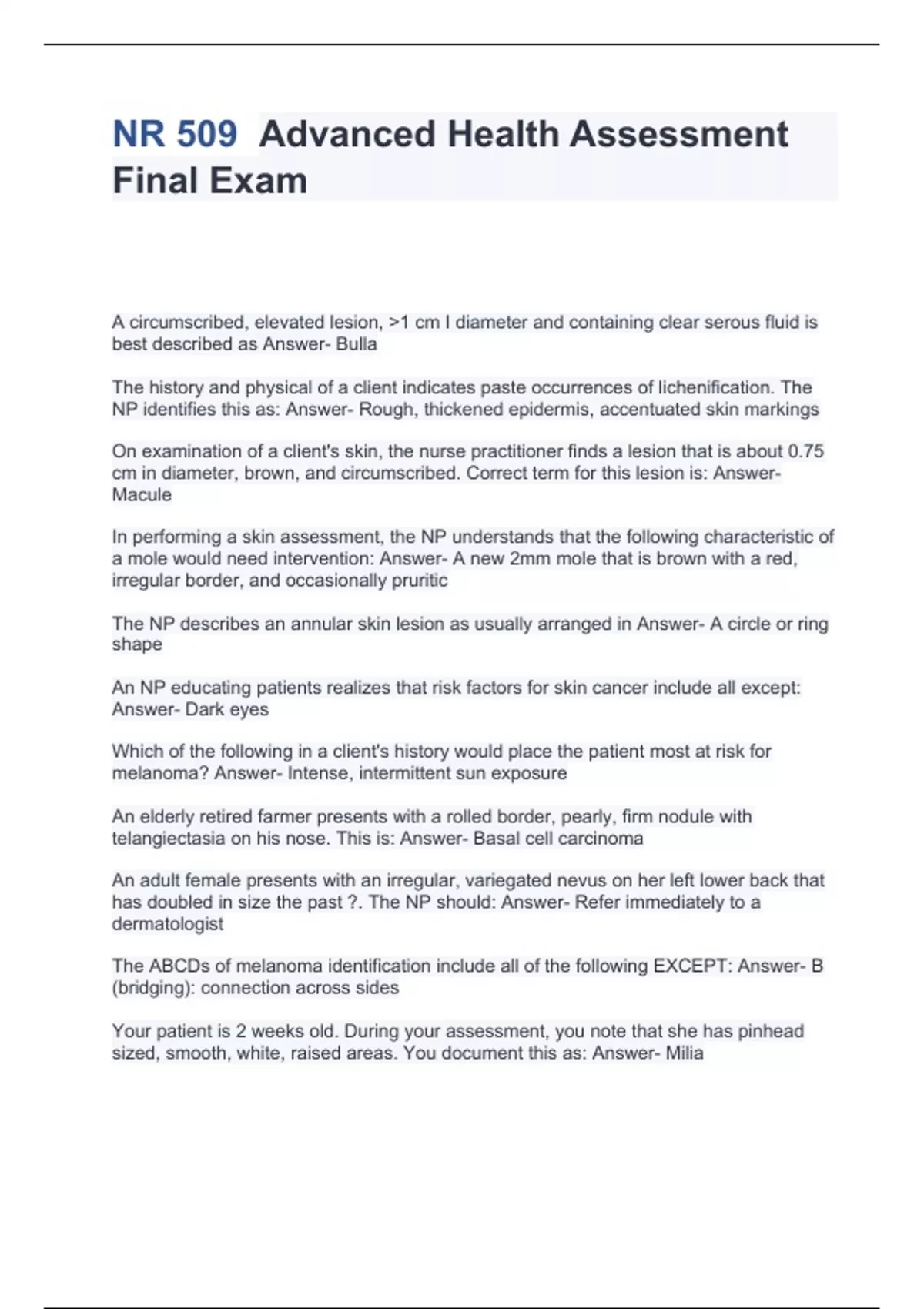 NR 509 Advanced Health Assessment Final Exam NR 509 Advanced Health Assessment Final Exam 2024 with complete solution