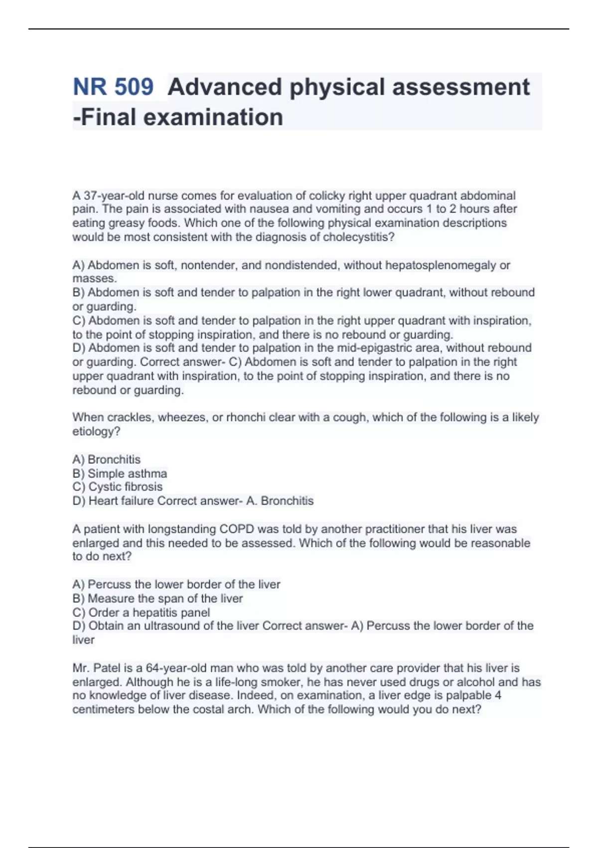 NR 509 Advanced physical assessment -Final examination 2024 Graded A;(Chamberlain)