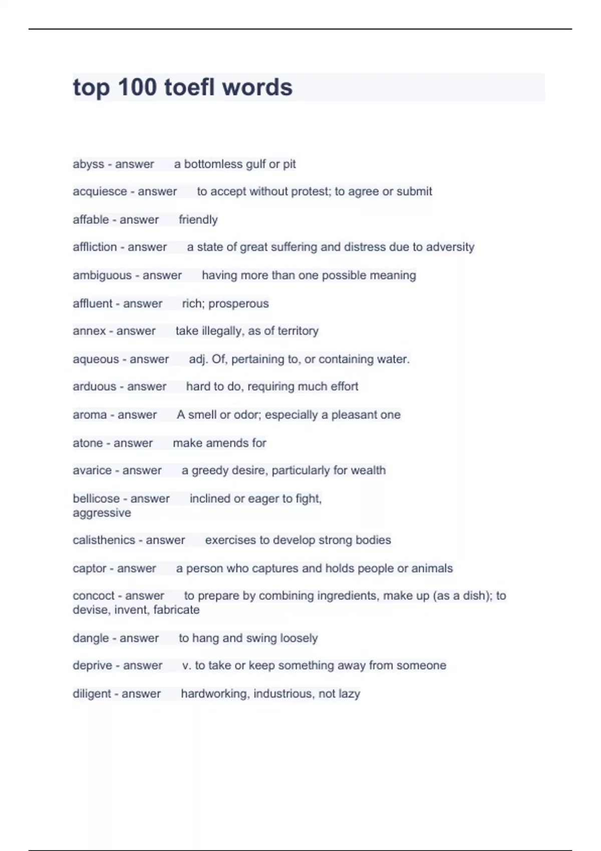 top 100 toefl words questions with correct answers 2024