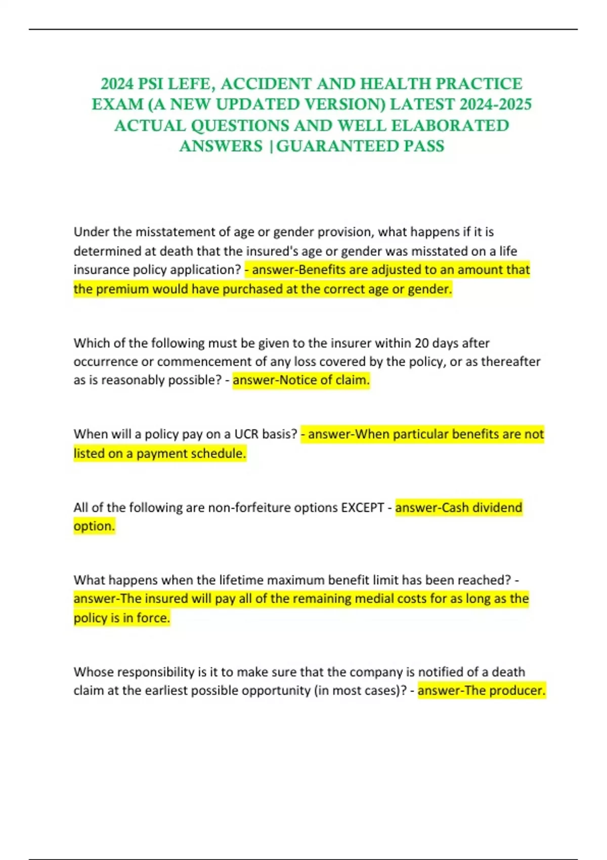 2024 PSI LIFE, ACCIDENT AND HEALTH PRACTICE EXAM (A NEW UPDATED VERSION) LATEST ACTUAL QUESTIONS AND WELL ELABORATED ANSWERS |GUARANTEED PASS