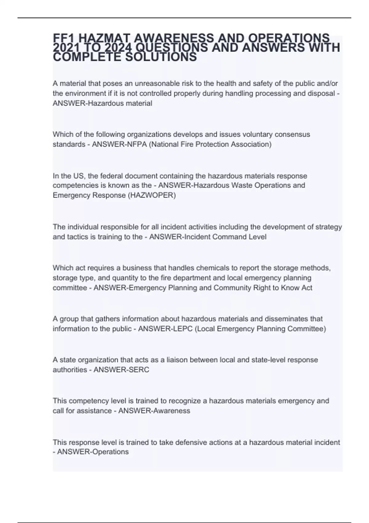 A material that poses an unreasonable risk to the health and safety of the public and/or the environment if it is not controlled properly during handling processing and disposal - ANSWER-Hazardous material Which of the following organizations develops and issues voluntary consensus standards - ANSWER-NFPA (National Fire Protection Association) In the US, the federal document containing the hazardous materials response competencies is known as the - ANSWER-Hazardous Waste Operations and Emergency Response (HAZWOPER) The individual responsible for all incident activities including the development of strategy and tactics is training to the - ANSWER-Incident Command Level Which act requires a business that handles chemicals to report the storage methods, storage type, and quantity to the fire department and local emergency planning committee - ANSWER-Emergency Planning and Community Right to Know Act A group that gathers information about hazardous materials and disseminates that information to the public - ANSWER-LEPC (Local Emergency Planning Committee) A state organization that acts as a liaison between local and state-level response authorities - ANSWER-SERC This competency level is trained to recognize a hazardous materials emergency and call for assistance - ANSWER-Awareness This response level is trained to take defensive actions at a hazardous material incident - ANSWER-Operations