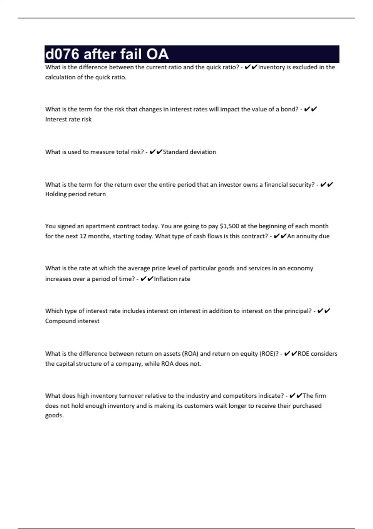 What is the difference between the current ratio and the quick ratio? - Inventory is excluded in the calculation of the quick ratio. What is the term for the risk that changes in interest rates will impact the value of a bond? - Interest rate risk What is used to measure total risk? - Standard deviation What is the term for the return over the entire period that an investor owns a financial security? - Holding period return You signed an apartment contract today. You are going to pay $1,500 at the beginning of each month for the next 12 months, starting today. What type of cash flows is this contract? - An annuity due What is the rate at which the average price level of particular goods and services in an economy increases over a period of time? - Inflation rate Which type of interest rate includes interest on interest in addition to interest on the principal? - Compound interest What is the difference between return on assets (ROA) and return on equity (ROE)? - ROE considers the capital structure of a company, while ROA does not. What does high inventory turnover relative to the industry and competitors indicate? - The firm does not hold enough inventory and is making its customers wait longer to receive their purchased goods.