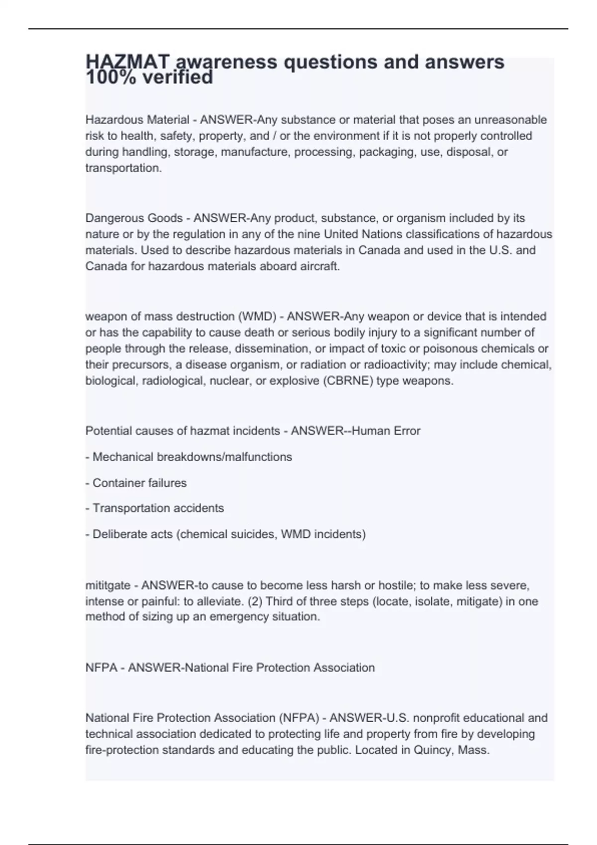 Hazardous Material - ANSWER-Any substance or material that poses an unreasonable risk to health, safety, property, and / or the environment if it is not properly controlled during handling, storage, manufacture, processing, packaging, use, disposal, or transportation. Dangerous Goods - ANSWER-Any product, substance, or organism included by its nature or by the regulation in any of the nine United Nations classifications of hazardous materials. Used to describe hazardous materials in Canada and used in the U.S. and Canada for hazardous materials aboard aircraft. weapon of mass destruction (WMD) - ANSWER-Any weapon or device that is intended or has the capability to cause death or serious bodily injury to a significant number of people through the release, dissemination, or impact of toxic or poisonous chemicals or their precursors, a disease organism, or radiation or radioactivity; may include chemical, biological, radiological, nuclear, or explosive (CBRNE) type weapons. Potential causes of hazmat incidents - ANSWER--Human Error - Mechanical breakdowns/malfunctions - Container failures - Transportation accidents - Deliberate acts (chemical suicides, WMD incidents) mititgate - ANSWER-to cause to become less harsh or hostile; to make less severe, intense or painful: to alleviate. (2) Third of three steps (locate, isolate, mitigate) in one method of sizing up an emergency situation. NFPA - ANSWER-National Fire Protection Association National Fire Protection Association (NFPA) - ANSWER-U.S. nonprofit educational and technical association dedicated to protecting life and property from fire by developing fire-protection standards and educating the public. Located in Quincy, Mass.
