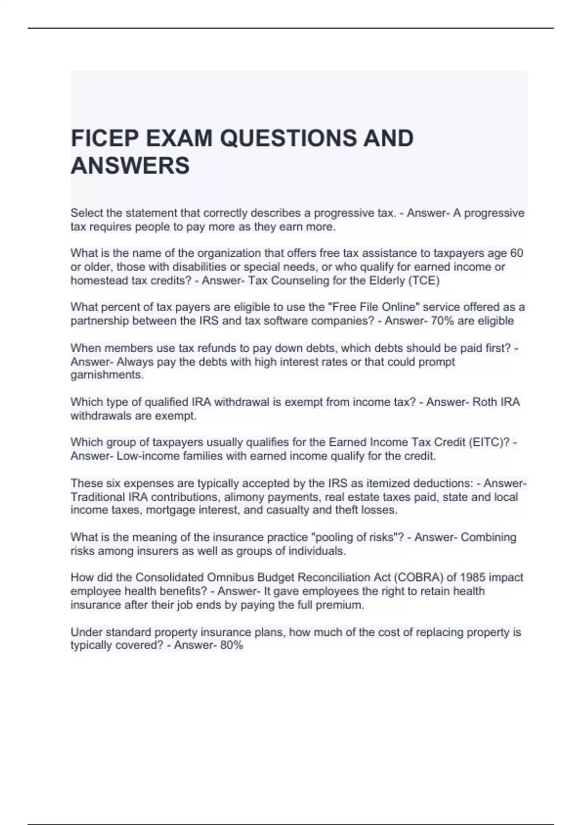 FICEP EXAM QUESTIONS AND ANSWERS